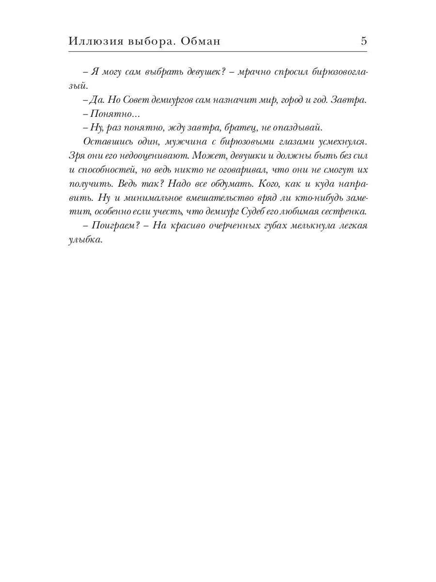 Handling time: 14 days Автор: Долгова Галина, «Иллюзия выбора. Обман»: Кто бы знал, что странная беседа с чудаковатым незнакомцем может привести к таким невообразимым последствиям! И дело даже не в смерти на ступенях собственного дома, а в том, что началось после. Чужое тело, ненависть, попытки убийства, заговоры, магия, нависшее над миром проклятье! А еще — страстное желание снова стать женщиной, ради которого можно пойти и на обман.
