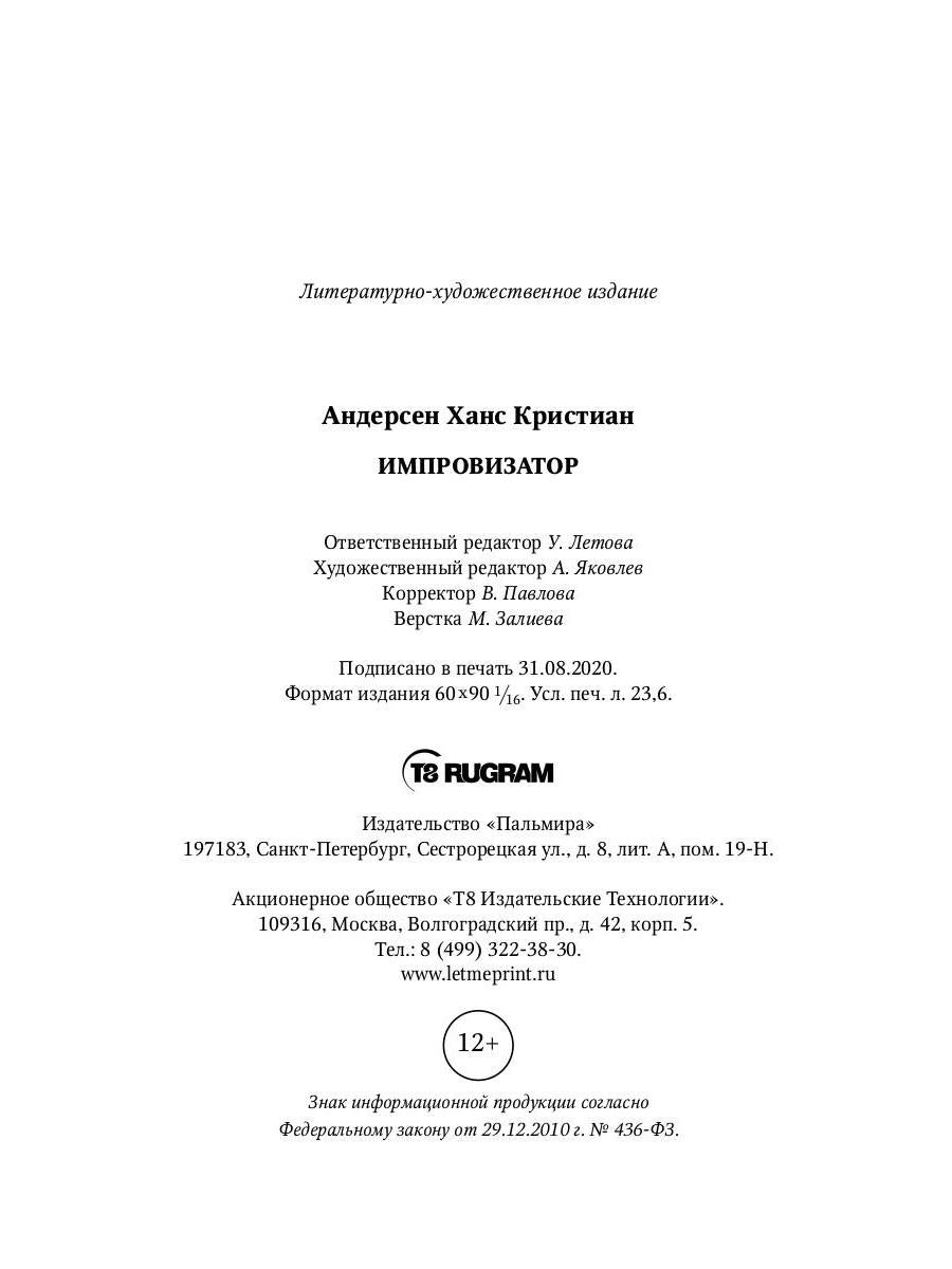 Handling time: 14 days Автор: Андерсен Ханс Кристиан, «Импровизатор»: Роман «Импровизатор» (1835) написан X.К. Андерсеном после того, как он побывал в Италии. Герой этого отчасти автобиографического романа поэт-импровизатор Антонио также отправляется в долгое путешествие. Неуверенного в себе, но талантливого юношу ждут многочисленные приключения и встречи, благодаря которым он обретает себя и утверждается в собственном праве на проявление чувств и своего поэтического дара. Выход в свет этого романа прославил X.К. Андерсена, а позднее это произведение было первым переведено на русский язык. В течение многих лет оно было самым читаемым из всех книг писателя.