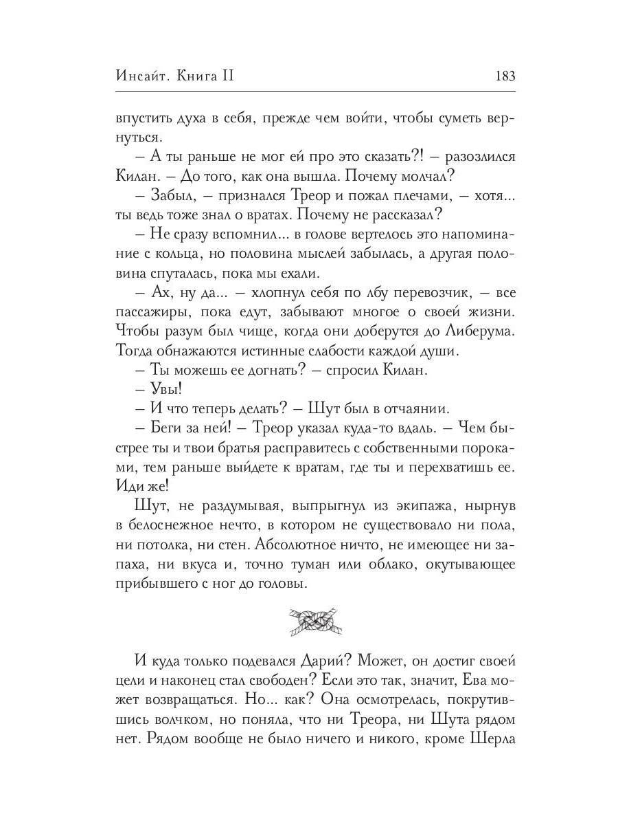 Handling time: 19 days Автор: Левицки Евгения, «Инсайт. Кн. 2. Левицки Е.»: Путешествие подходит к концу. Впереди Большой Эмпорий, и все узлы вот-вот развяжутся. Ева с друзьями возвращается в Сомнус, чтобы собрать недостающие звенья в истории Дария. Только теперь судьба некроманта Ландегора переплетается с ее собственной, а цена правды оказывается непомерно высокой. События разворачиваются совсем не так, как этого ожидает Ева, и дар неизбежно ведет ее на путь, с которого не возвращаются…