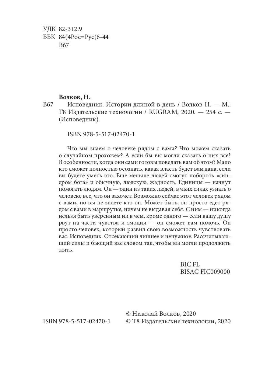 #ASTTD# Search Terms: Волков Н. , Volkov N. , Т8 RUGRAM(Волков Николай / RUGRAM) , T8 RUGRAM(Volkov Nikolai / RUGRAM) , Исповедник , Ispovednik , 9785517024701 , 978-5-517-02470-1 , 1609494