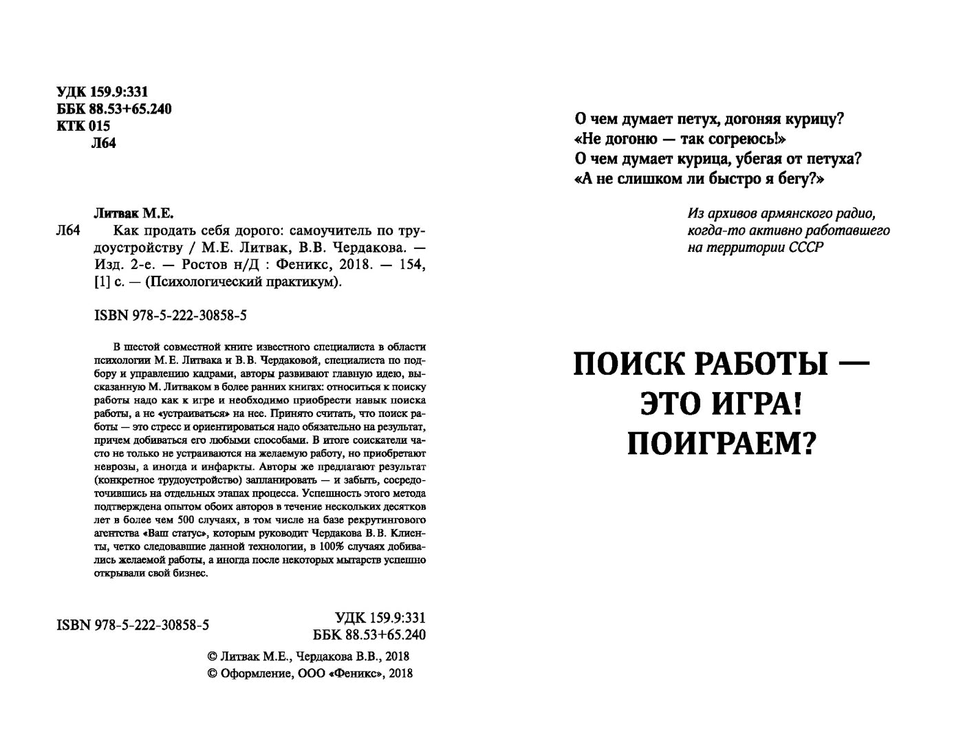 В шестой совместной книге известного специалиста в области психологии M.E. Литвака и В.Б. Чердаковой, специалиста по подбору и управлению кадрами, авторы развивают главную идею, высказанную М. Литваком в более ранних книгах: относиться к поиску работы надо как к игре и необходимо приобрести навык поиска работы, а не "устраиваться" на нее. Принято считать, что поиск работы - это стресс и ориентировался надо обязательно на результат, причем добивался его любыми способами. В итоге соискатели часто не только не устраиваются на желаемую работу, но приобретают неврозы, а иногда и инфаркты. Авторы же предлагают результат (конкретное трудоустройство) запланировать - и забыть, сосредоточившись на отдельных этапах процесса. Успешность этого метода подтверждена опытом обоих авторов в течение нескольких десятков лет в более чем 500 случаях, и том числе на базе рекрутингового агентства "Ваш статус", которым руководит Чердакова В. В. Клиенты, четко следовавшие данной технологии, в 100% случаях добивались желаемой работы, а иногда после некоторых мытарств успешно открывали свой бизнес.С автографом М. Литвака.