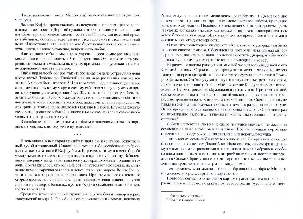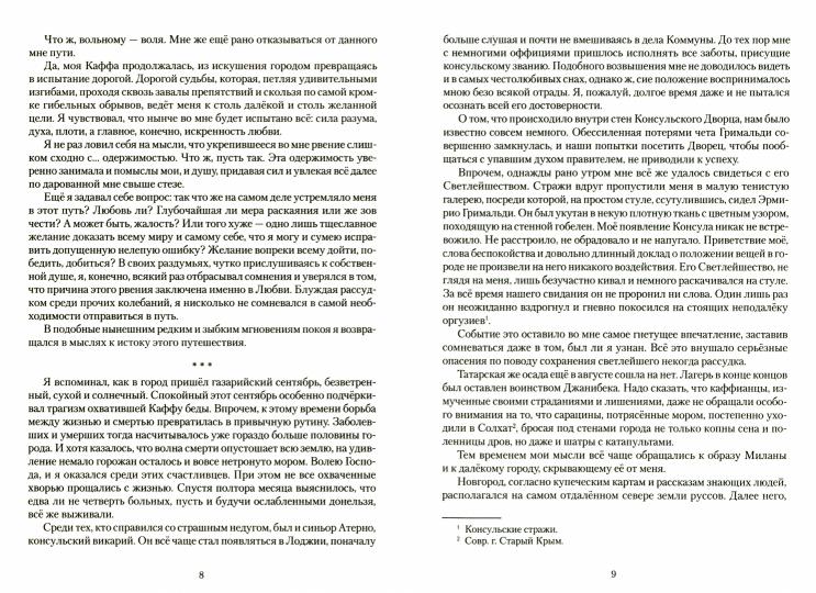 Handling time: 19 days Автор: Морянин Олег, «Каффа. Книга третья»: Продолжение истории молодого синьора Антонио из генуэзского дома дель Франко, покинувшего родную Геную и отправившегося на службу в газарийские колонии. Поиски возлюбленной оборачиваются для Антонио чередой новых испытаний, на протяжении которых ему доводится принять посольскую грамоту, сразиться с разбойниками и отвечать на княжеском суде.