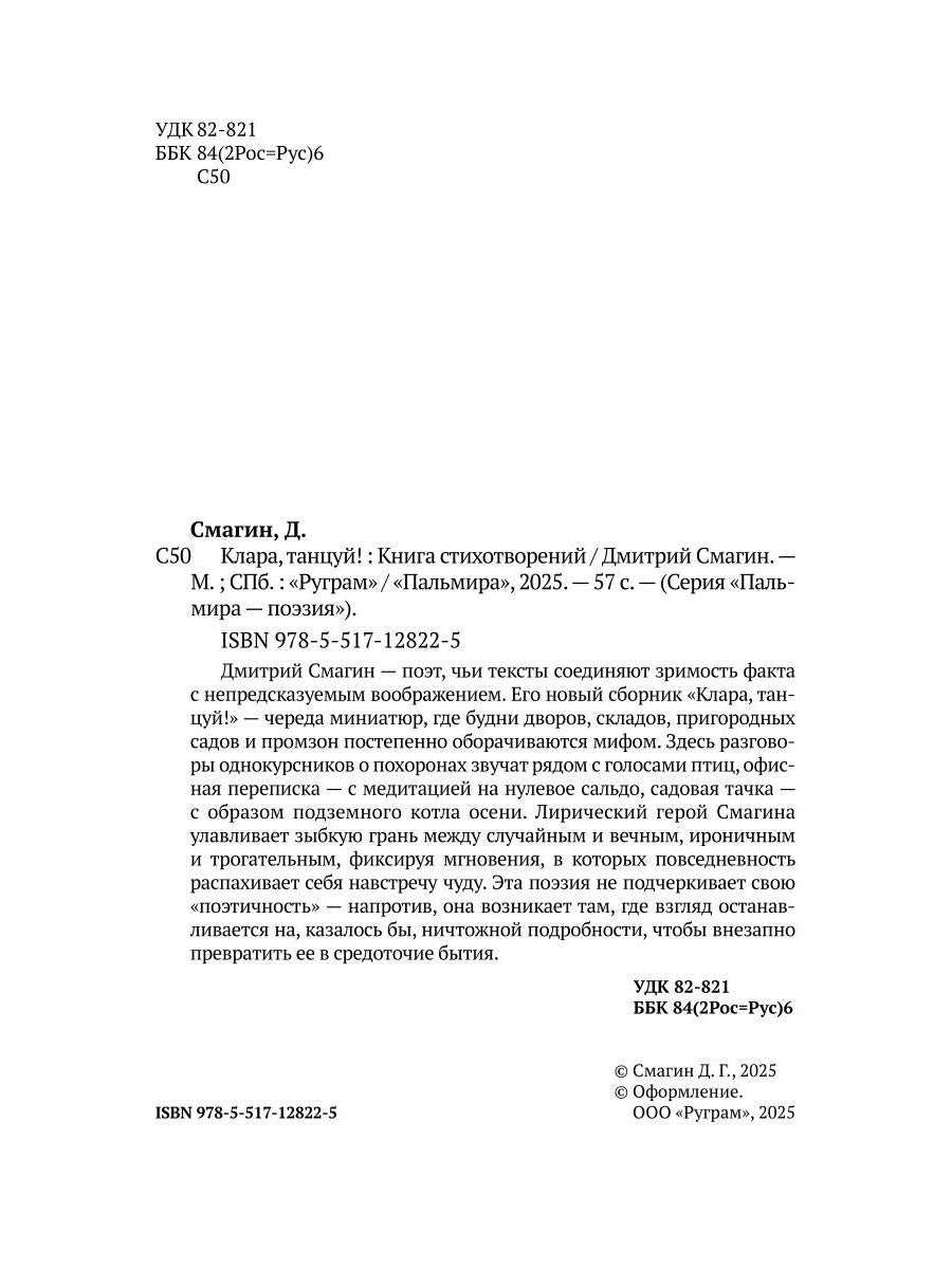 Handling time: 14 days Автор: Смагин Дмитрий, «Клара, танцуй! Книга стихотворений»: Дмитрий Смагин - поэт, чьи тексты соединяют зримость факта с непредсказуемым воображением. Его новый сборник «Клара, танцуй!» - череда миниатюр, где будни дворов, складов, пригородных садов и промзон постепенно оборачиваются мифом. Здесь разговоры однокурсников о похоронах звучат рядом с голосами птиц, офисная переписка - с медитацией на нулевое сальдо, садовая тачка - с образом подземного котла осени. Лирический герой Смагина улавливает зыбкую грань между случайным и вечным, ироничным и трогательным, фиксируя мгновения, в которых повседневность распахивает себя навстречу чуду. Эта поэзия не подчеркивает свою «поэтичность» - напротив, она возникает там, где взгляд останавливается на, казалось бы, ничтожной подробности, чтобы внезапно превратить ее в средоточие бытия.