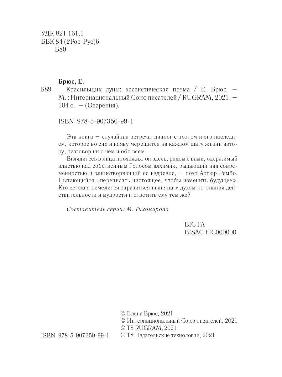 Handling time: 14 days Автор: Брюс Елена, «Красильщик луны. Эссеистическая поэма»: Эта книга — случайная встреча, диалог с поэтом и его наследием, которое во сне и наяву мерещится на каждом шагу жизни автору, разговор ни о чем и обо всем. Вглядитесь в лица прохожих: он здесь, рядом с вами, одержимый властью над собственным Голосом алхимик, рыдающий над современностью и олицетворяющий ее издревле, — поэт Артюр Рембо. Пытающийся «переписать настоящее, чтобы изменить будущее». Кто сегодня осмелится заразиться пьянящим духом познания действительности и мудрости и ответить ему тем же?