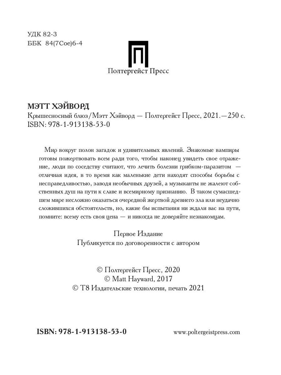 Handling time: 19 days Автор: Хэйворд Мэтт, «Крышесносный блюз»: Мир вокруг полон загадок и удивительных явлений. Знакомые вампиры готовы пожертвовать всем ради того, чтобы наконец увидеть свое отражение, люди по соседству считают, что лечить болезни грибком-паразитом – отличная идея, в то время как маленькие дети находят способы борьбы с несправедливостью, заводя необычных друзей, а музыканты не жалеют собственных душ на пути к славе и всемирному признанию. В таком сумасшедшем мире несложно оказаться очередной жертвой древнего зла или неудачно сложившихся обстоятельств, но, какие бы испытания ни ждали вас на пути, помните: всему есть своя цена – и никогда не доверяйте незнакомцам.