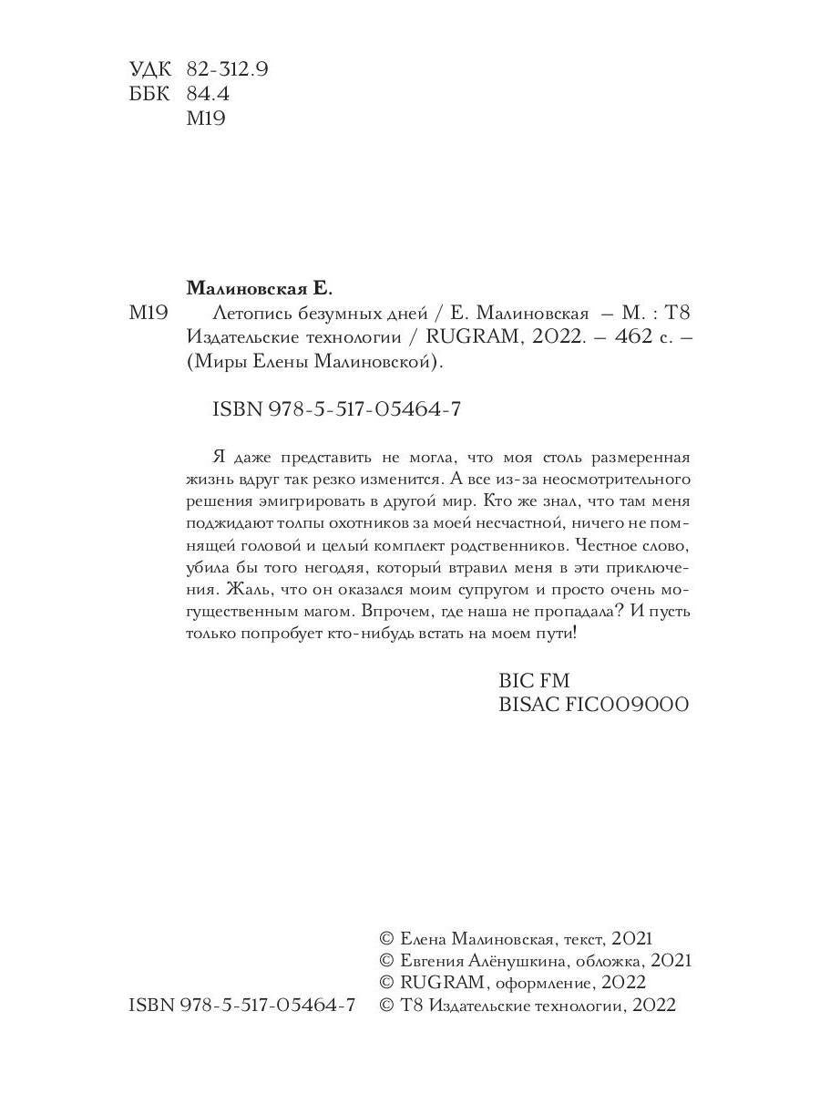Handling time: 19 days Автор: Малиновская Елена, «Летопись безумных дней»: Я даже представить не могла, что моя столь размеренная жизнь вдруг так резко изменится. А все из-за неосмотрительного решения эмигрировать в другой мир. Кто же знал, что там меня поджидают толпы охотников за моей несчастной, ничего не помнящей головой и целый комплект родственников. Честное слово, убила бы того негодяя, который втравил меня в эти приключения. Жаль, что он оказался моим супругом и просто очень могущественным магом. Впрочем, где наша не пропадала? И пусть только попробует кто-нибудь встать на моем пути!