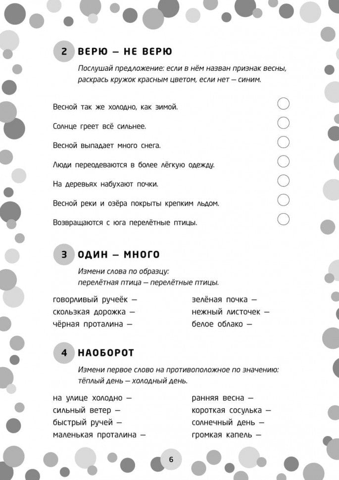 Handling time: 19 days Годовой курс занятий для подготовки детей 5-7 лет к школе от опытного логопеда. Часть 3, «Весна». Пригодится родителям дошкольников, воспитателям подготовительных групп детских садов. • 100 игр для развития речи • 17 заданий для профилактики дисграфии • 11 "весенних" лексических тем В тетради 100 логопедических игр на развитие речи, логического мышления и мелкой моторики. Задания для профилактики дисграфии выделены звездочкой: они помогут предупредить частые ошибки письма. Для одного занятия достаточно двух-четырёх игр. Занимаясь с ребенком по развивающей логопедической тетради, вы заложите основы грамотной речи и письма. Это очень важная часть подготовки к школе!