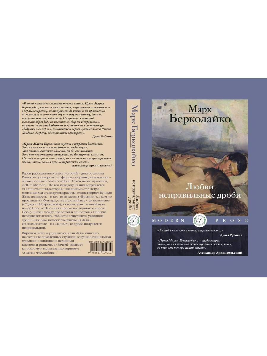 Handling time: 19 days Автор: Берколайко Марк, «Любви неправильные дроби»: Герои рассказанных здесь историй — доктор химии Римского университета, физик-лазерщик, математики — жизнелюбивы и жизнестойки. Это сильные мужчины, «self-made men», делающие и уже сделавшие себя сами. Но вот каждому из них встречается та единственная, которая, независимо от быстро меняющихся стандартов красоты, олицетворяет Вечную Женственность — и кто-то пугается («Прыжки»), в ком-то просыпается бунтарь, отвергающий все «так положено» («Седер на Искровской»), а кто-то делит земной путь на «до Нее», «с Нею» и беспросветно одинокое «после Нее» («Жизнь между прологом и эпилогом»). И никто не удивляется тому, что, если в числителе условной дроби «Любовь» поместить ответы на «Как?», а в знаменателе — на «Зачем?», то дробь получается неправильной.