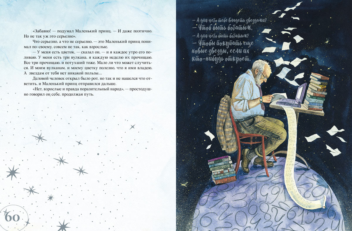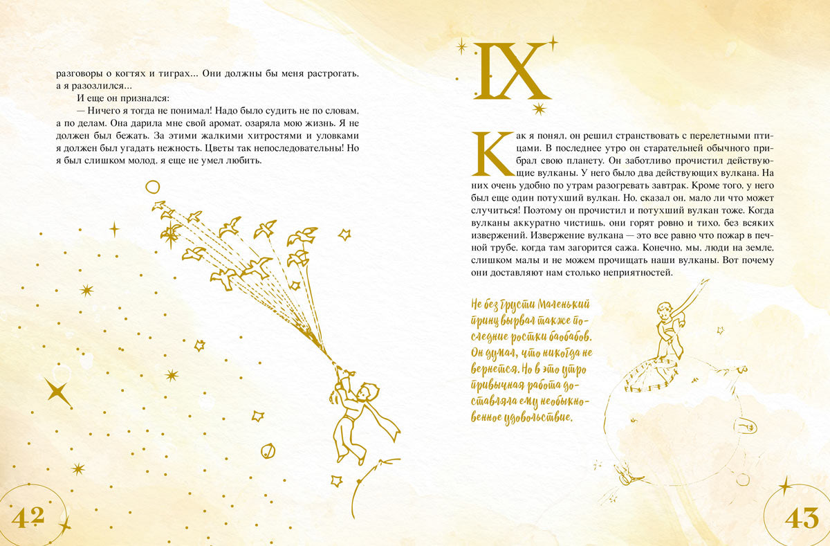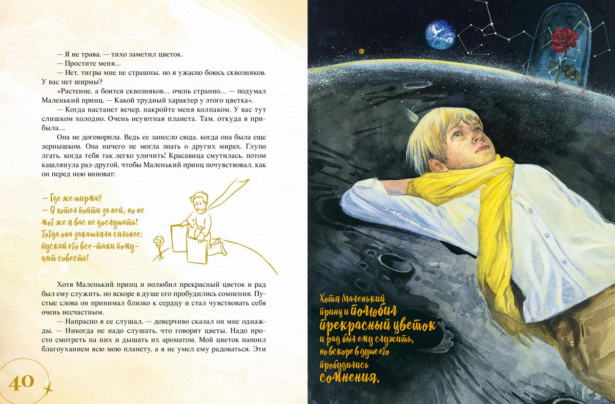 "Однажды один лётчик потерпел крушение в пустыне. Он очень удивился, повстречав в столь безлюдном и отдалённом месте Маленького Принца. А как известно, пустыня совсем не предназначена для маленьких мальчиков. Но Маленький Принц оказался здесь не случайно, он ищет путь домой, путь к своей родной планете и прекрасной любимой Розе Всеми любимая сказка-притча раскроет и взрослым, и детям важность и ценность чувств, доверия, дружбы и любви. Каждый найдёт здесь ответ на вопрос, который его беспокоит. Каждый увидит отражение своих мыслей. Каждый познакомится со своим Маленьким Принцем. Иллюстрации Анны Зайцевой вкупе с дизайном Юлии Верповской визуально подчёркивают магию воображения и слова Антуана де Сент-Экзюпери."