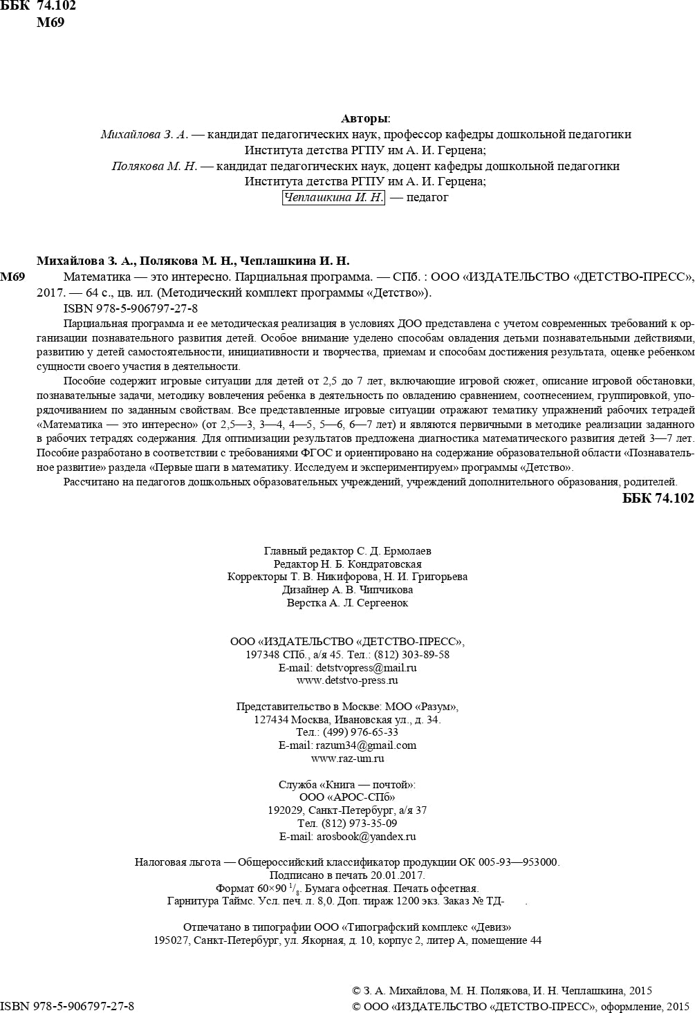 #ASTTD# Search Terms: Михайлова З.А.; Полякова М. Н.; Чеплашкина Ирина Николаевна , Mihailova Z.A.; Polyakova M. N.; Cheplashkina Irina Nikolaevna , Детство-Пресс , Detstvo-Press , Русский , Rysskii , Образовательная программа дошкольного образования "Детство" и методический комплект к ней , Obrazovatelnaya programma doshkolnogo obrazovaniya "Detstvo" i metodicheskii komplekt k nei , 9785906797278 , 978-5-906797-27-8 , 508802