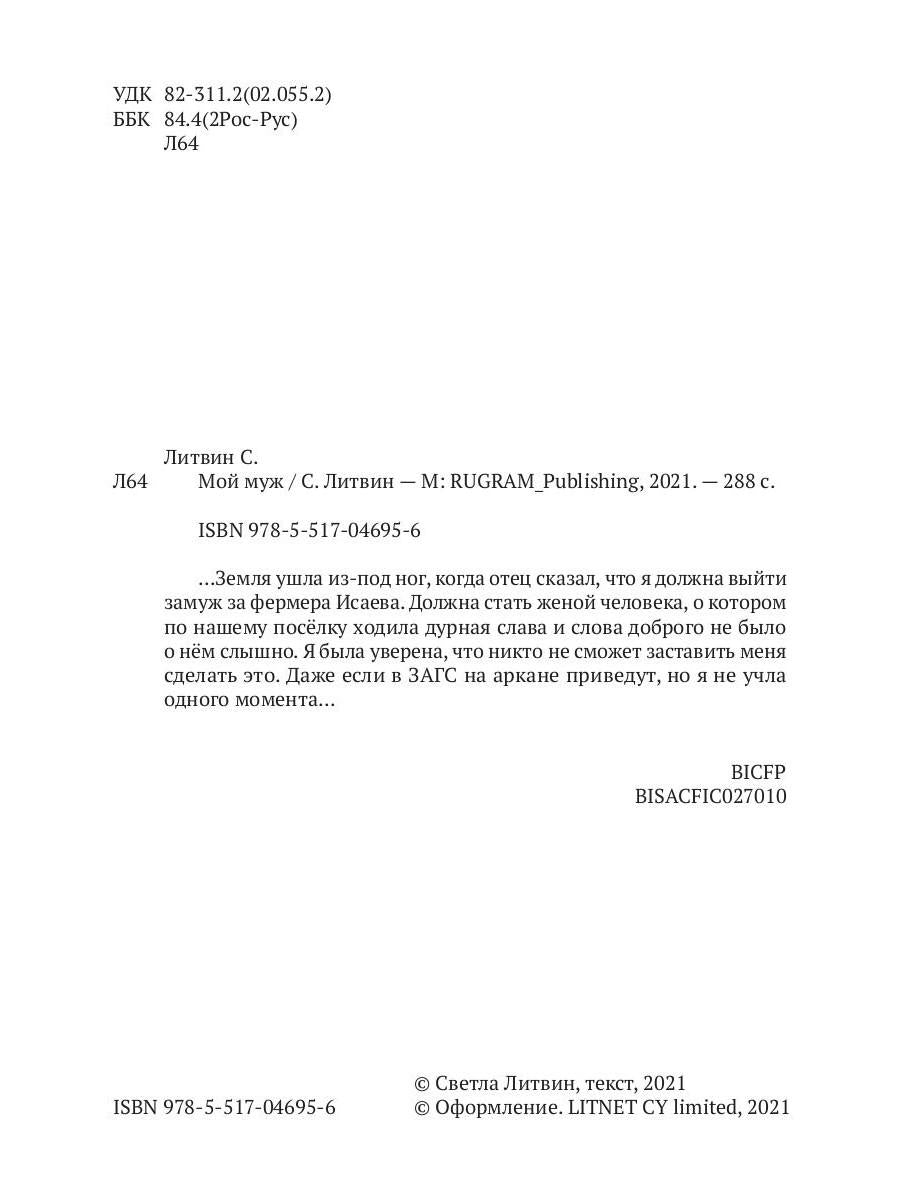 Handling time: 19 days Автор: Литвин Светла, «Мой муж»: ...Земля ушла из-под ног, когда отец сказал, что я должна выйти замуж за фермера Исаева. Должна стать женой человека, о котором по нашему посёлку ходила дурная слава и слова доброго не было о нём слышно. Я была уверена, что никто не сможет заставить меня сделать это. Даже если в ЗАГС на аркане приведут, но я не учла одного момента...