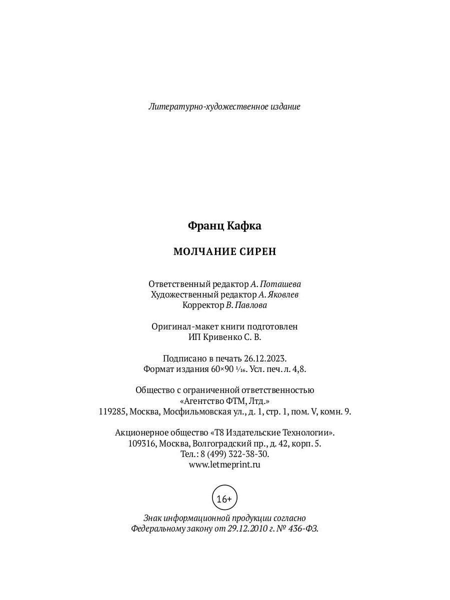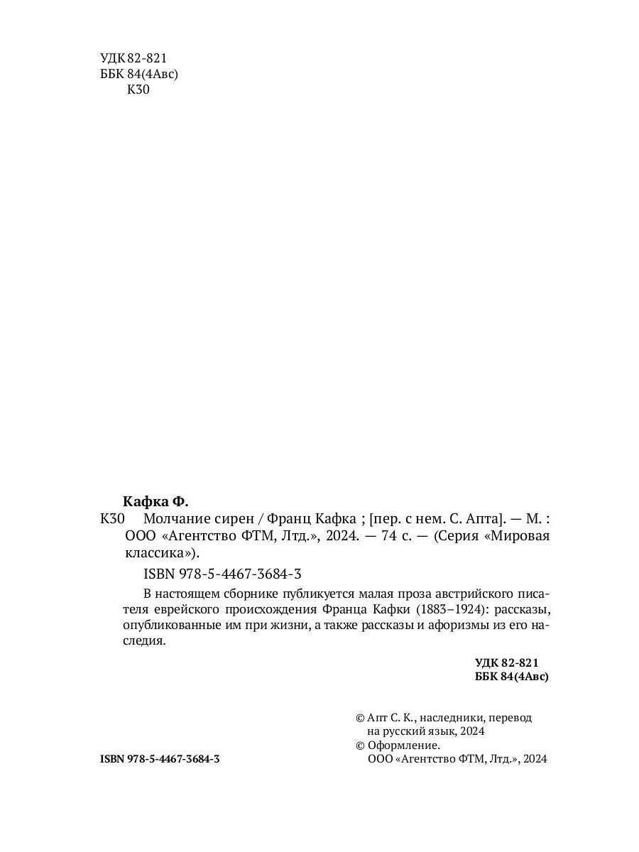 Handling time: 14 days Автор: Кафка Ф., «Молчание сирен»: В настоящем сборнике публикуется малая проза австрийского писателя еврейского происхождения Франца Кафки (1883–1924): рассказы, опубликованные им при жизни, а также рассказы и афоризмы из его наследия.