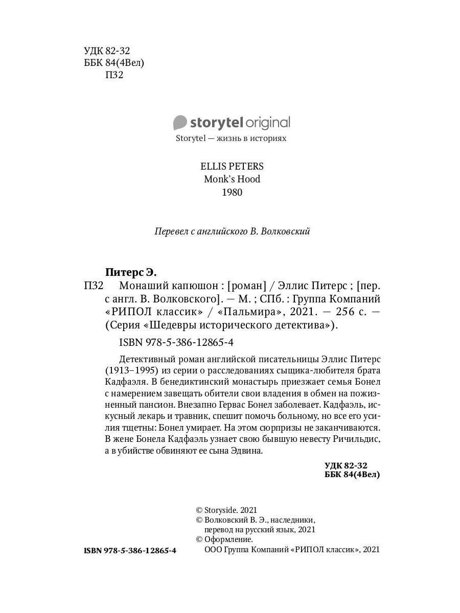 Handling time: 19 days Автор: Питерс Эллис, «Монаший капюшон»: «Монаший капюшон» (Эллис Питерс) — детективный роман английской писательницы из серии о расследованиях сыщика-любителя брата Кадфаэля. В бенедиктинский монастырь приезжает семья Бонел с намерением завещать обители свои владения в обмен на пожизненный пансион. Внезапно Гервас Бонел заболевает. Кадфаэль, искусный лекарь и травник, спешит помочь больному, но все его усилия тщетны: Бонел умирает. На этом сюрпризы не заканчиваются. В жене Бонела Кадфаэль узнает свою бывшую невесту Ричильдис, а в убийстве обвиняют ее сына Эдвина.