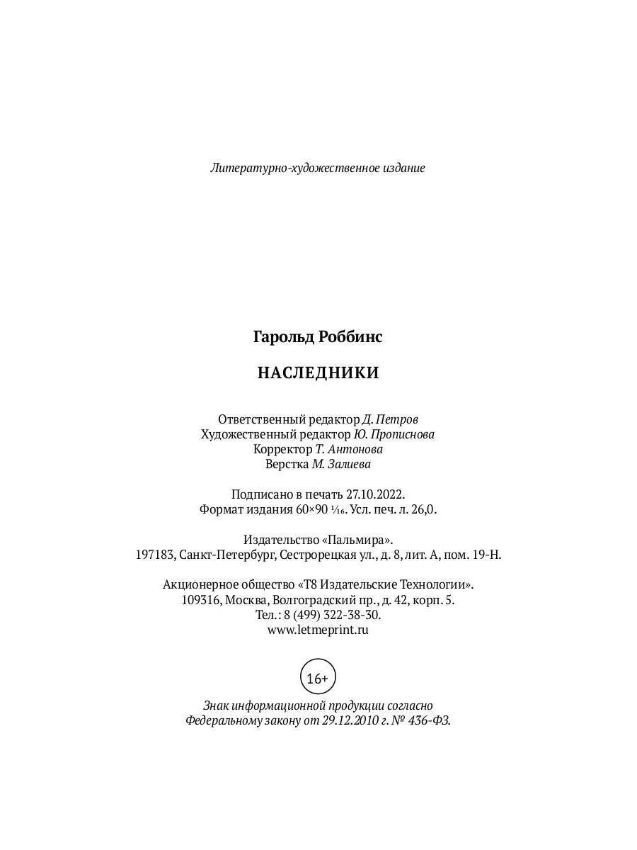 Handling time: 19 days Автор: Роббинс Г., «Наследники: роман»: Гарольд Роббинс - это человек, который изобрел секс в современной литературе. The New Yorker. "Наследники" - третий роман "Голливудской трилогии" Гарольда Роббинса, в которой автор прослеживает всю историю Голливуда - от его зарождения до конца 1960-х. Романы его похожи на голливудские блокбастеры - деньги, секс, страсть, карьера, предательства, мечты... И все то, на что способен человек, чтобы сделать мечту реальностью... Великий американский роман о великой американской мечте. Playboy