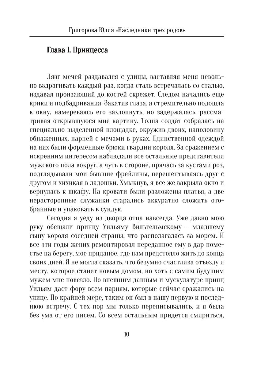 Handling time: 19 days Автор: Григорова Юлия, «Наследники трех родов»: Прожив двадцать лет во дворце, принцесса Вентира и представить не могла, чем для нее обернется долгожданная поездка к жениху. Ее жизнь рухнула за считаные дни. Лишившись всего, что у нее было, девушка поняла, что как раньше уже не будет. Отправившись на поиски сбежавшей сестры, Зеланис не знал, кого может встретить на своем пути. А вот если бы знал, то обошел бы стороной место, где наткнулся на принцессу, изменившую его жизнь. Оказавшись в водовороте не зависящих от них событий, герои даже не представляют, куда заведет судьба, что свела их.