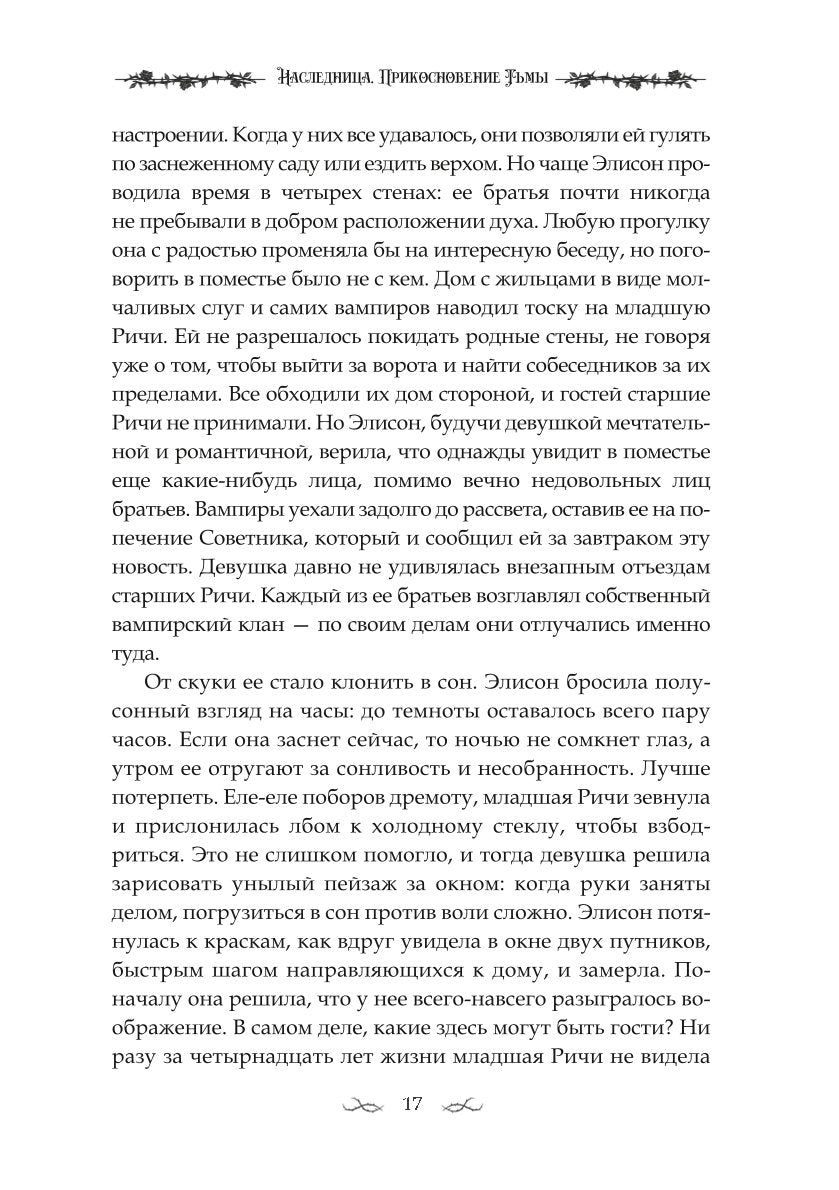 Элисон Ричи — наследница древнего рода — долгие годы жила затворницей в собственном доме, не подозревая о чудовищном наследии предков. Родственная опека старших братьев давно превратилась в контроль, переходящий все границы. Но жажда свободы и пережитые потрясения пробуждают в ней силу, не желающую мириться с принятыми в семье Ричи устоями. Элисон бросается в круговорот событий, не представляя, куда заведет ее сделанный выбор и чем придется пожертвовать.