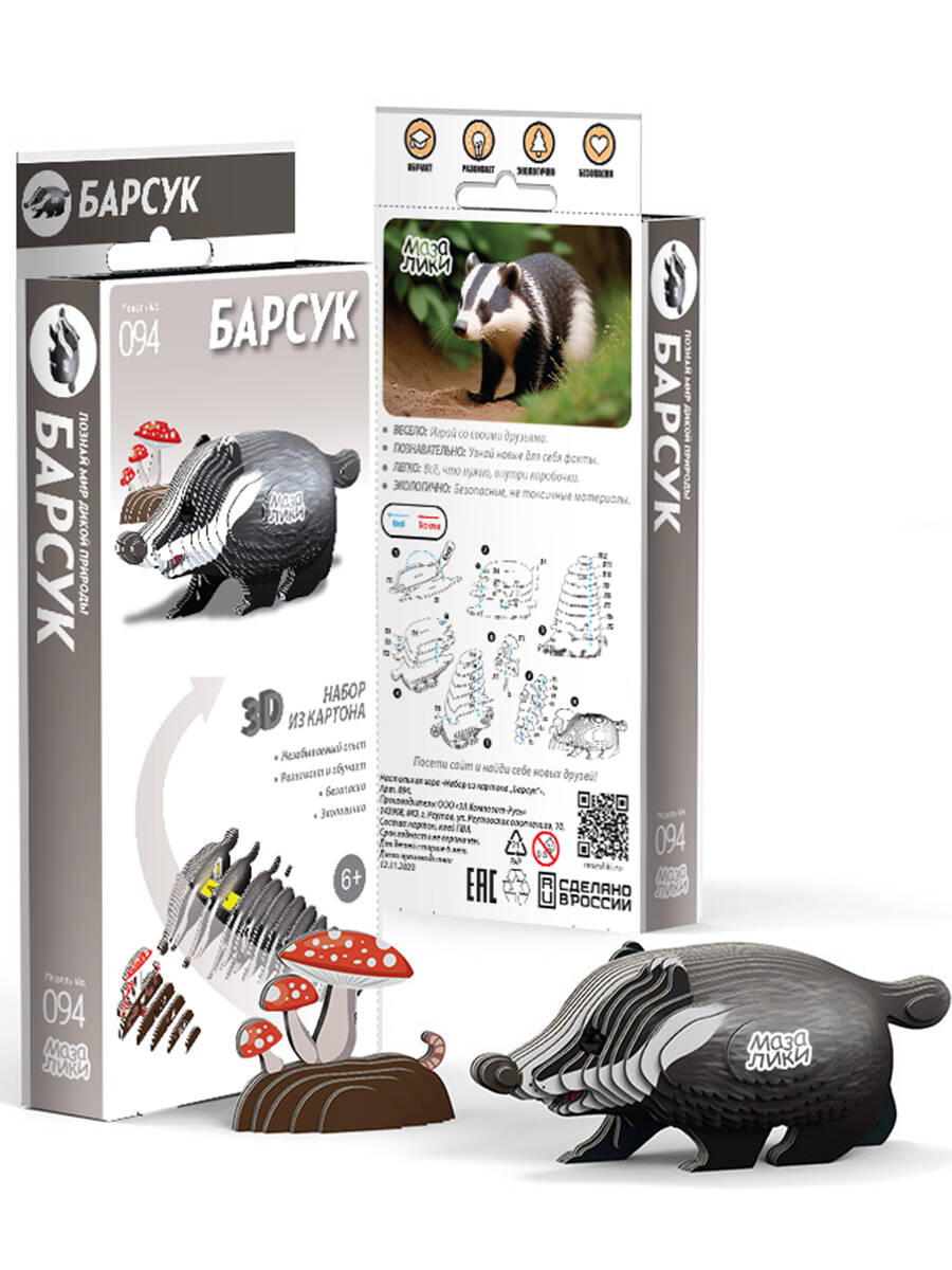 Handling time: 14 days Развивающие 3Д пазл "Мазалики" "094 Барсук". В комплекте есть все что нужно для сборки.Собирайте без труда и дополнительных инструментов.Вот что вы получите:Картонная коробка с информацией — 1 шт.Карточки с пронумерованными деталями — 7 шт.Тюбик клея, 5 мл — 1 шт.Бусинки-глазки в бумажном пакетике — 2 шт.Листовка с описанием.Барсук – очень умное животное.Барсуки живут целыми семьями в одном месте в течение многих лет. Они передают свои норы и гнезда потомкам, создавая сложные системы подземных городов с лабиринтами, переходами и просторными сухими "комнатами". Их гнездовые камеры, иногда расположенные на нескольких уровнях, организованы и ухожены, с вентиляцией и несколькими аварийными выходами для безопасности.Отличительная черта этой игрушки – наличие дополнительного "продовольственного набора" Барсука. Это целый отдельный холмик с грибами и червяками, любимым лакомством этого животного. А это значит, что ваш новый друг не останется голодным.Кстати, вы знали, что Барсук является символом факультета Пуффендуй в серии романов Джоан Роулинг о Гарри Поттере?