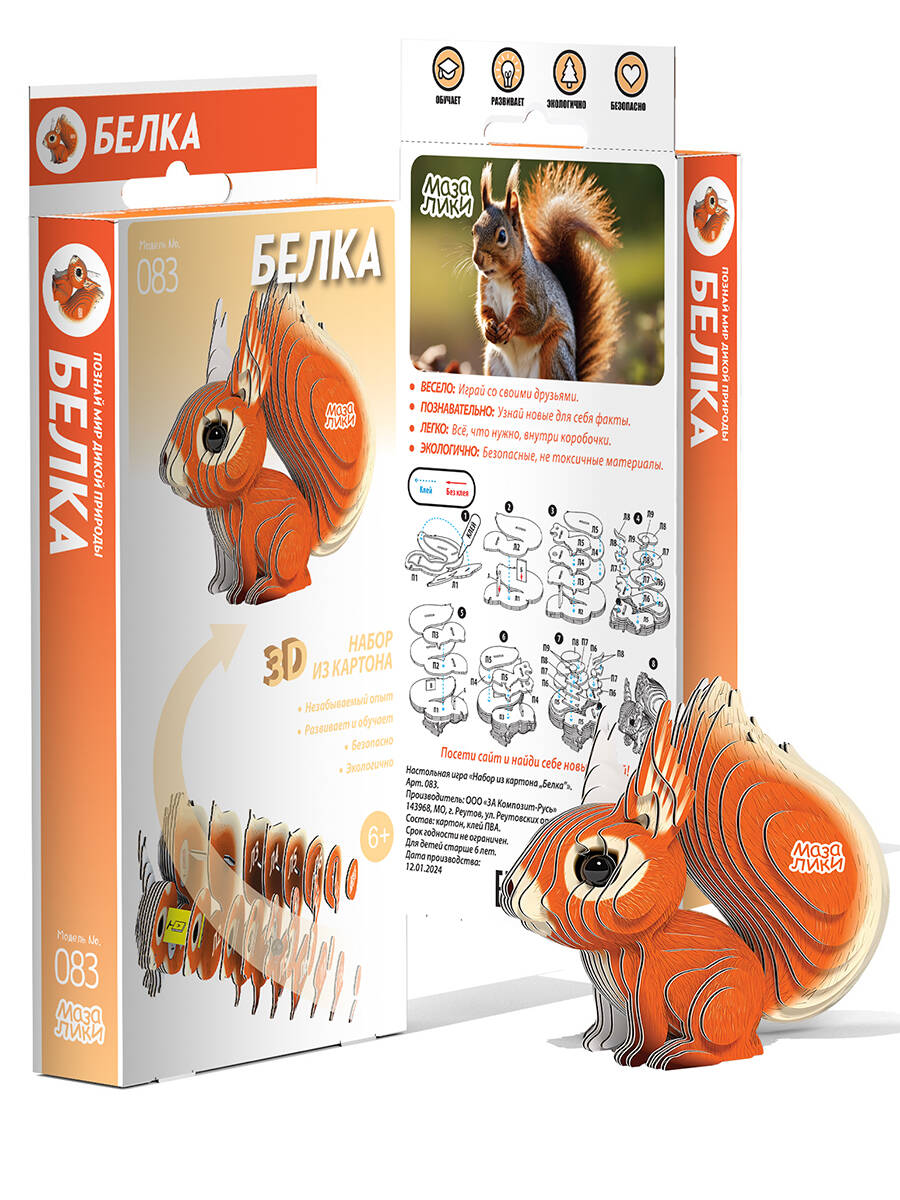Handling time: 14 days Развивающие 3Д пазл "Мазалики" "083 Белка". В комплекте есть все что нужно для сборки.Собирайте без труда и дополнительных инструментов.Вот что вы получите:Картонная коробка с информацией — 1 шт.Карточки с пронумерованными деталями — 7 шт.Тюбик клея, 5 мл — 1 шт.Бусинки-глазки в бумажном пакетике — 2 шт.Листовка с описанием.Тайна разгадана! Знакомьтесь с нашим новым персонажем – Любознательной Белкой. Это существо с удивительной страстью к орехам, но знали ли вы о их невероятной роли в жизни леса? Белки, закапывая орехи на зиму, не всегда могут их найти. Забытые орехи дарят жизнь новым деревьям, обогащая и восстанавливая лесные массивы.Вдохновитесь удивительной интуицией и игривостью белок, собирая наш новый пазл "Белка". Познакомьтесь поближе с жизнью этих милейших зверьков.Мазалики - это не просто игрушка, а окно в мир природы, где каждое существо играет ключевую роль.