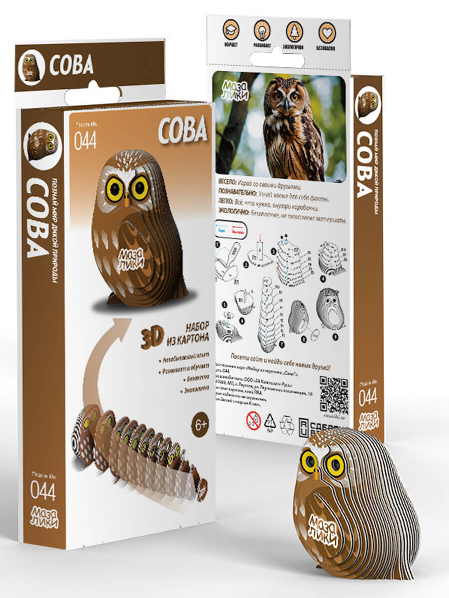 Handling time: 14 days Развивающие 3Д пазл "Мазалики" "044 Сова". В комплекте есть все что нужно для сборки.Собирайте без труда и дополнительных инструментов.Вот что вы получите:Картонная коробка с информацией — 1 шт.Карточки с пронумерованными деталями — 7 шт.Тюбик клея, 5 мл — 1 шт.Бусинки-глазки в бумажном пакетике — 2 шт.Листовка с описанием.Погрузитесь в мир птиц с помощью головоломки Сова от Мазалики. Наша тщательно продуманная головоломка отражает сущность этих великолепных птиц, демонстрируя их экстраординарные черты и способности. Обладая острым бинокулярным зрением, совы - искусные охотники, бесшумно набрасывающиеся на свою добычу, не издавая ни звука.Собирая этот замысловато оформленный пазл, вы перенесетесь в залитый лунным светом лес, где безраздельно правят совы.Приготовьтесь быть очарованными красотой и грацией этих ночных созданий, собирая воедино эту увлекательную головоломку совы.
