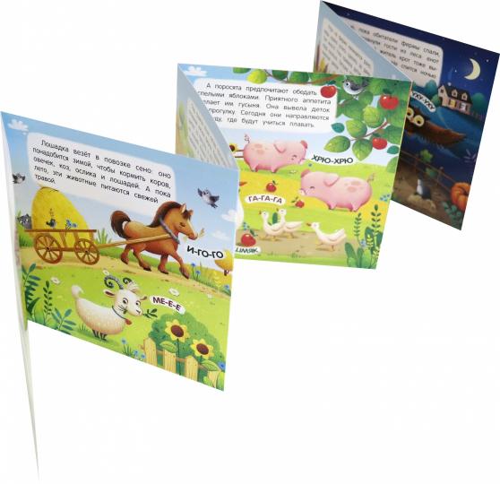 Книжка-гармошка «На ферме» познакомит малыша с уточками, свинками, осликом, лошадью, индюком и другими жителями фермы.Малыш сможет развить речь при помощи подражания звукам «ко-ко-ко», «кукареку», «пи-пи» и другим.Приведенные здесь варианты рассчитаны на развитие речи малыша, а потому условны и могут отличаться от звуков, которые животные издают в действительности. Для совместной работы с родителями.