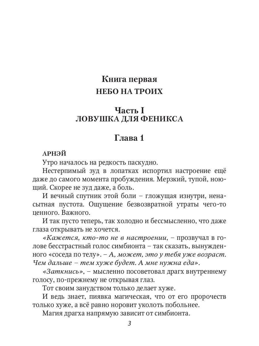 Handling time: 19 days Автор: Хант Диана, «Небо на троих и два дракона в подарок»: Меня зовут Ингури Рамаян и это история моего падения. Спасая свою жизнь, я заключила сделку с высшими драгхами. Ещё вчера мы были врагами. Сегодня — я принадлежу сразу двоим. Многие осудят, но... только в их объятиях я получу ответы на главные вопросы. Что привело нас к войне — которая обернула реки вспять, и понесла по ветру горы, словно сухие листья? К войне, что лишила драконов крыльев, а фениксов заковала в рабские ошейники на тысячу лет. Я узнаю, каково это быть чьей-то страстью, одержимостью, навязчивой идеей. И каково это... самой любить больше жизни. Меня зовут Ингури и это история моего падения. И моей любви.
