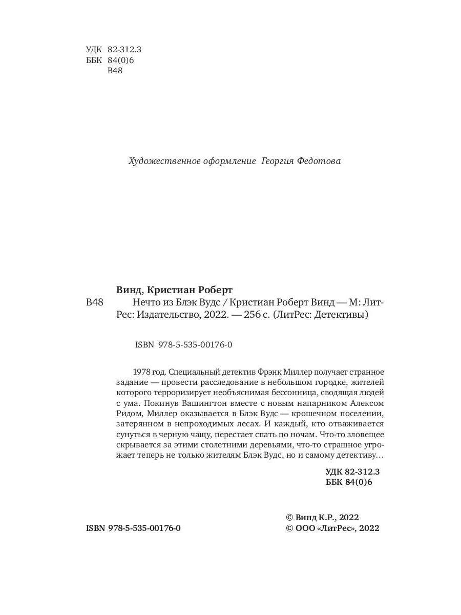Handling time: 19 days Автор: Винд Кристиан Роберт, «Нечто из Блэк Вудс»: 1978 год. Специальный детектив Фрэнк Миллер получает странное задание — провести расследование в небольшом городке, жителей которого терроризирует необъяснимая бессонница, сводящая людей с ума. Покинув Вашингтон вместе с новым напарником Алексом Ридом, Миллер оказывается в Блэк Вудс — крошечном поселении, затерянном в непроходимых лесах. И каждый, кто отваживается сунуться в черную чащу, перестает спать по ночам. Что-то зловещее скрывается за этими столетними деревьями, что-то страшное угрожает теперь не только жителям Блэк Вудс, но и самому детективу…
