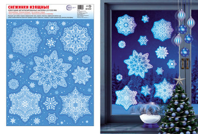 *НМТ-15337 Новогодние наклейки на окна А4+ В ПАКЕТЕ. Снежинки изящные (серебряная металлизация, многоразовые, в индивидуальной упаковке, с европодвесом и клеевым клапаном)