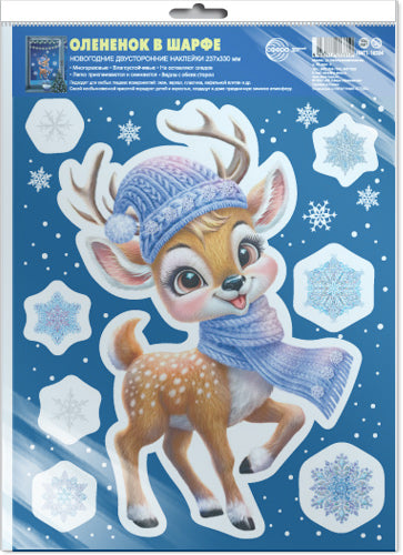 *НМТ1-16504 НОВОГОДНИЕ НАКЛЕЙКИ НА ОКНА А4+ В ПАКЕТЕ. Олененок в шарфе (видны с обеих сторон, снежинки из белил, в индивидуальной упаковке, с европодвесом и клеевым клапаном)