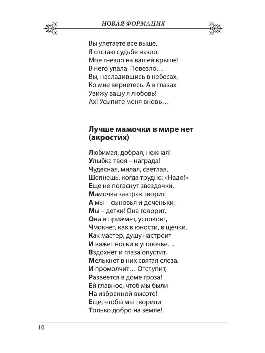 Handling time: 14 days «Новая формация»: 13 декабря 2019 года в Государственной Думе состоялось вручение наград лучшим русскоязычным авторам, организованное при участии Интернационального Союза писателей. В ознаменование этого события, важного не только для ИСП, но и для общего литературного процесса, был составлен сборник произведений лучших авторов - участников мероприятия. Произведения, помещенные в сборник, разнообразны по стилистике и жанрам, а значит, это издание поможет представить полную картину современной литературы. Особое внимание в сборнике уделено стихам и прозе для детей, ибо воспитание молодого поколения, будущего читателя и деятеля - важная задача литературы. Приятного чтения!