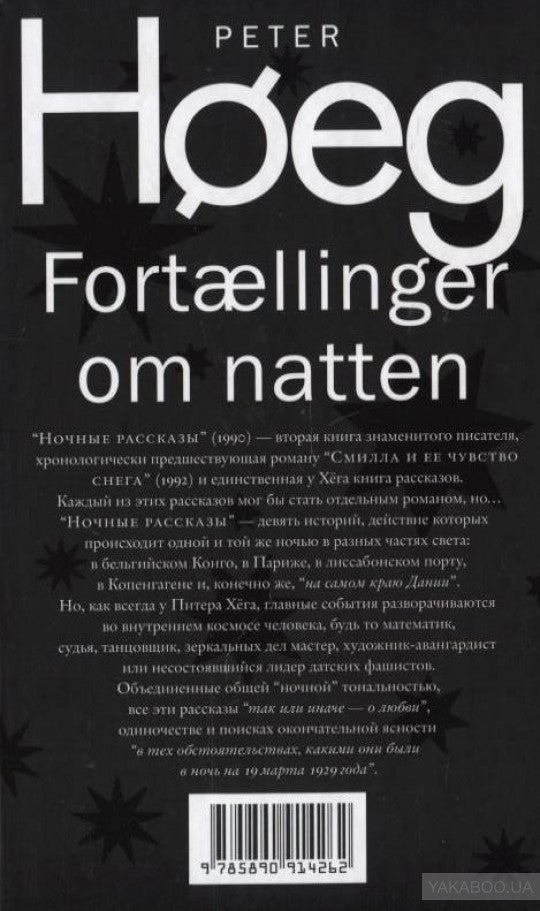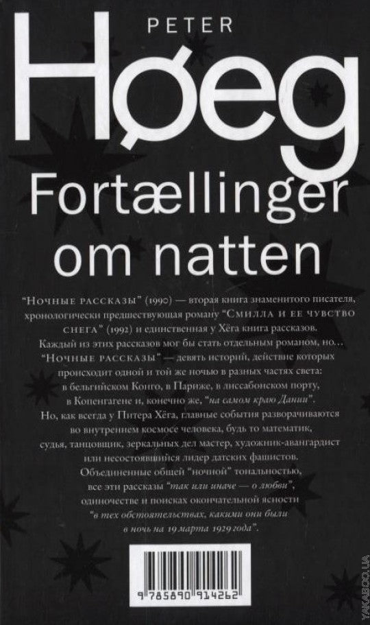 Handling time: 34 days «Ночные рассказы» (1990) — вторая книга знаменитого писателя, хронологически предшествующая роману «Смилла и ее чувство снега» (1992), и единственная у Хёга книга рассказов. Каждый из этих рассказов мог бы превратиться в отдельный роман, но… «Ночные рассказы» — это девять историй, действие которых происходит одной и той же ночью в разных частях света: в бельгийском Конго, в Париже, в лиссабонском порту, в Копенгагене и, конечно же, «на самом краю Дании». Но, как всегда у Питера Хёга, главные события разворачиваются во внутреннем космосе человека, будь то математик, судья, танцовщик, зеркальных дел мастер, художник-авангардист или несостоявшийся лидер датских фашистов. Объединенные общей «ночной» тональностью, все эти рассказы, «так или иначе, — о любви», одиночестве и поисках окончательной ясности, «в тех обстоятельствах, какими они были в ночь на 19 марта 1929 года». Peter Høeg Fortællinger om natten перевод с датского Е.Красновой