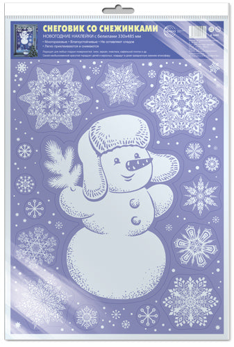 *Н-16485 НОВОГОДНИЕ НАКЛЕЙКИ А3+ В ПАКЕТЕ. Снеговик со снежинками (белила, многоразовые, видны с обеих сторон, в индивидуальной упаковке, с европодвесом и клеевым клапаном)