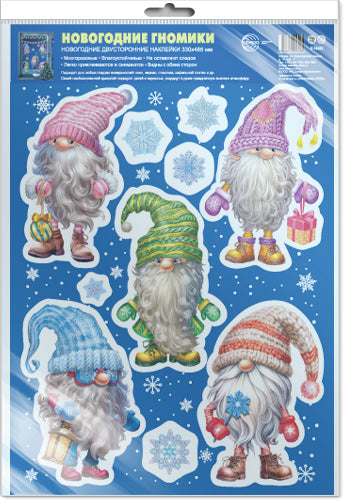 *Н-16492 НОВОГОДНИЕ НАКЛЕЙКИ А3+ В ПАКЕТЕ. Новогодние Гномики (многоразовые, видны с обеих сторон, в индивидуальной упаковке, с европодвесом и клеевым клапаном)