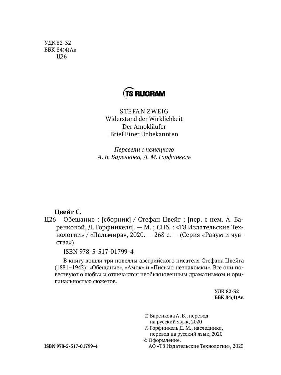 Handling time: 19 days Автор: Цвейг Стефан, «Обещание»: В книгу вошли три новеллы австрийского писателя Стефана Цвейга (1881–1942): «Обещание», «Амок» и «Письмо незнакомки». Все они повествуют о любви и отличаются необыкновенным драматизмом и оригинальностью сюжетов.