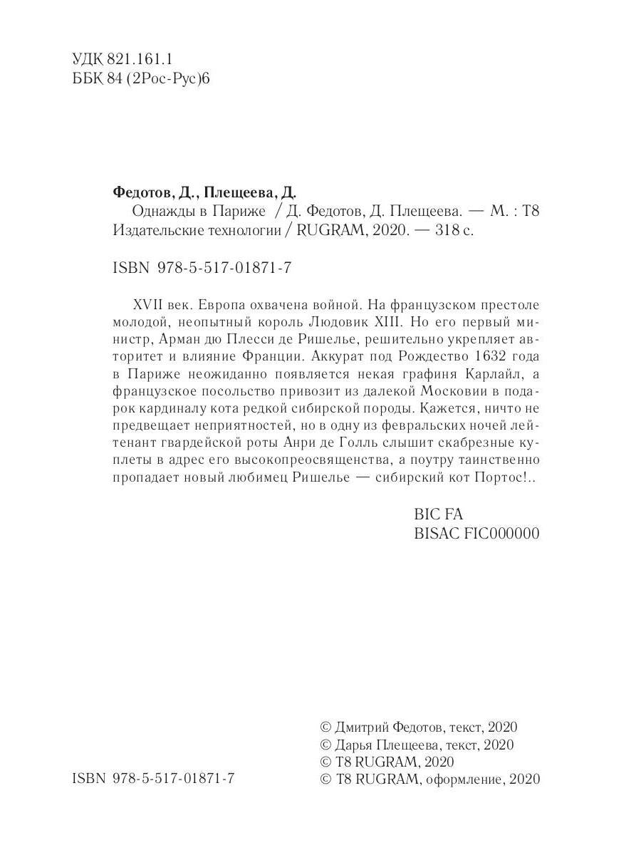 Handling time: 19 days Авторы: Плещеева Д., Федотов Д., «Однажды в Париже»: XVII век. Европа охвачена войной. На французском престоле молодой, неопытный король Людовик XIII. Но его первый министр, Арман дю Плесси де Ришелье, решительно укрепляет авторитет и влияние Франции. Аккурат под Рождество 1632 года в Париже неожиданно появляется некая графиня Карлайл, а французское посольство привозит из далекой Московии в подарок кардиналу кота редкой сибирской породы. Кажется, ничто не предвещает неприятностей, но в одну из февральских ночей лейтенант гвардейской роты Анри де Голль слышит скабрезные куплеты в адрес его высокопреосвященства, а поутру таинственно пропадает новый любимец Ришелье — сибирский кот Портос!..