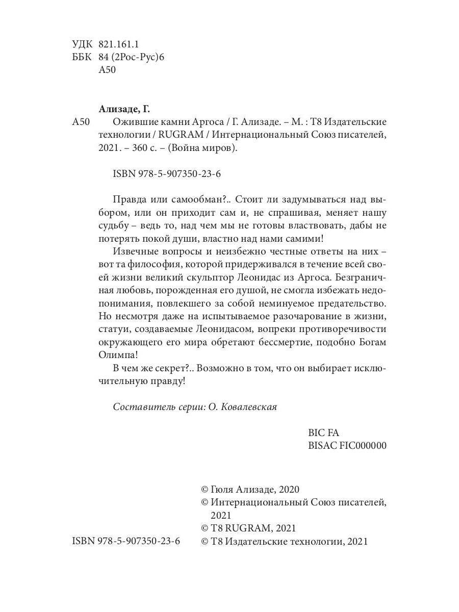 Handling time: 14 days Автор: Ализаде Гюля, «Ожившие камни Аргоса»: Правда или самообман?.. Стоит ли задумываться над выбором, или он приходит сам и, не спрашивая, меняет нашу судьбу - ведь то, над чем мы не готовы властвовать, дабы не потерять покой души, властно над нами самими! Извечные вопросы и неизбежно честные ответы на них -вот та философия, которой придерживался в течение всей своей жизни великий скульптор Леонидас из Аргоса. Безграничная любовь, порожденная его душой, не смогла избежать недопонимания, повлекшего за собой неминуемое предательство. Но несмотря даже на испытываемое разочарование в жизни, статуи, создаваемые Леонидасом, вопреки противоречивости окружающего его мира обретают бессмертие, подобно Богам Олимпа! В чем же секрет?.. Возможно в том, что он выбирает исключительную правду!