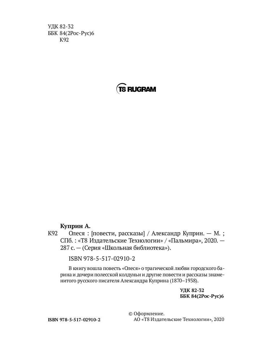 Handling time: 19 days Автор: Куприн Александр, «Олеся»: В книгу вошла повесть «Олеся» о трагической любви городского барина и дочери полесской колдуньи и другие повести и рассказы знаменитого русского писателя Александра Куприна (1870-1938).