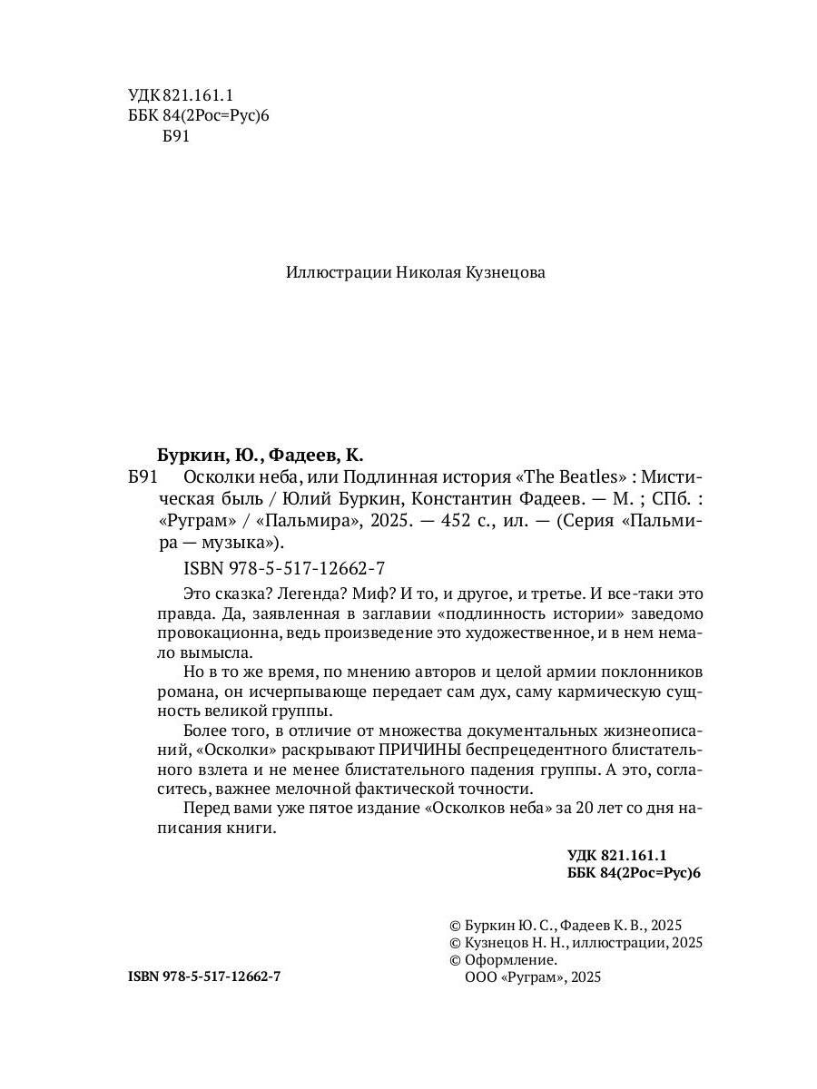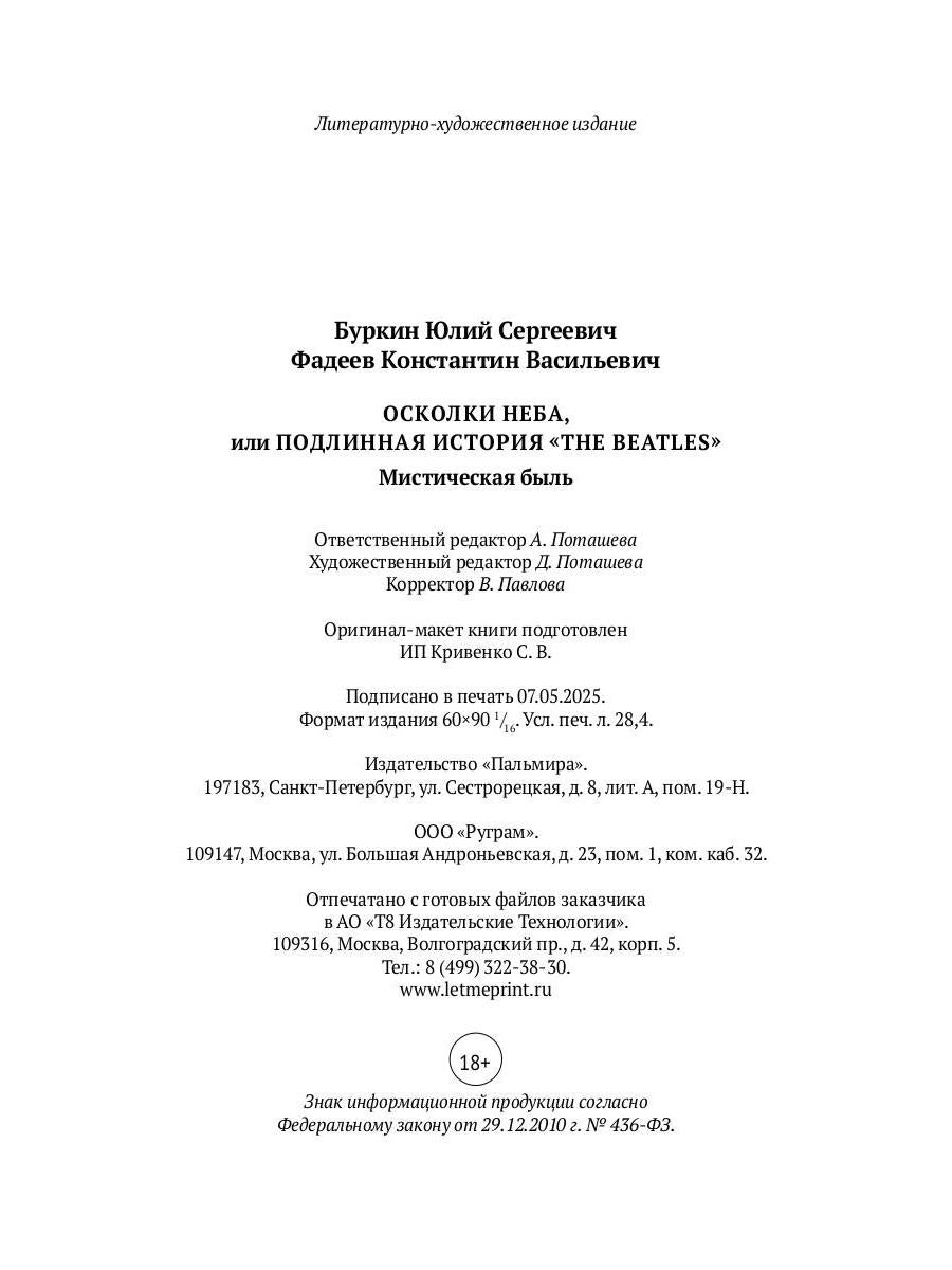 Handling time: 19 days Авторы: Буркин Юлий, Фадеев К.В., «Осколки неба, или Подлинная история "The Beatles": Мистическая быль»: Это сказка? Легенда? Миф? И то, и другое, и третье. И все-таки это правда. Да, заявленная в заглавии «подлинность истории» заведомо провокационна, ведь произведение это художественное, и в нем немало вымысла. Но в то же время, по мнению авторов и целой армии поклонников романа, он исчерпывающе передает сам дух, саму кармическую сущность великой группы. Более того, в отличие от множества документальных жизнеописаний, «Осколки» раскрывают ПРИЧИНЫ беспрецедентного блистательного взлета и не менее блистательного падения группы. А это, согласитесь, важнее мелочной фактической точности. Перед вами уже пятое издание «Осколков неба» за 20 лет со дня написания книги.