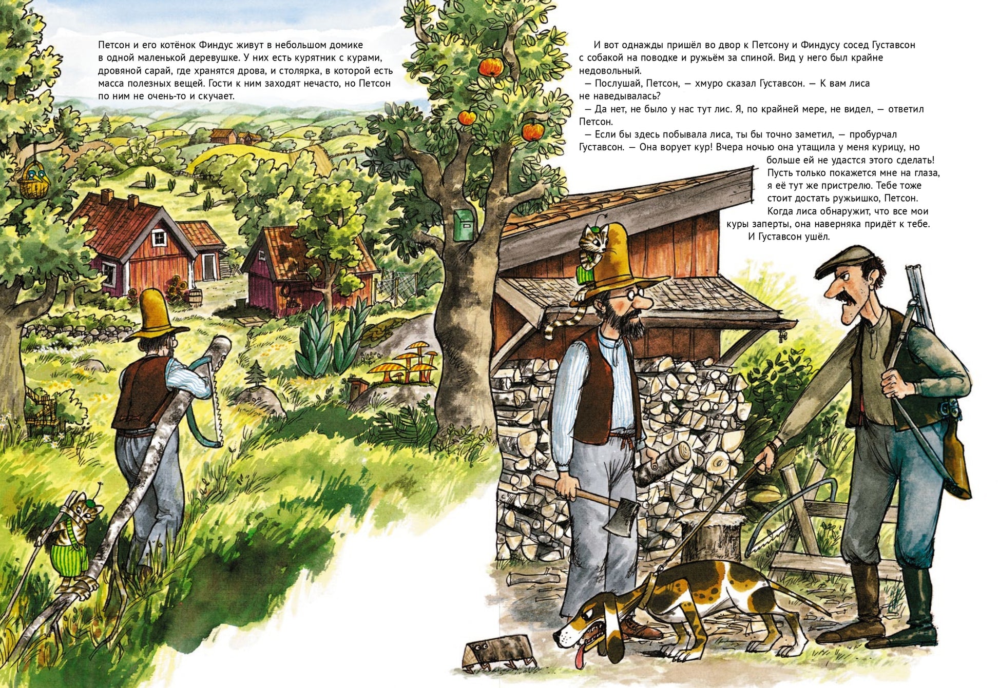 Однажды к Петсону и Финдусу зашел их сосед Густавсон, который сказал, что в округе появилась лиса, ворующая кур. Но Финдус против охоты на лис, лису надо перехитрить, считает он. Поэтому вместе с Петсоном они придумывают хитроумный способ напугать лису, чтобы ей больше было неповадно наведываться в курятники. Друзья приготовили для лисы настоящее светопредставление: взрывы петард и фейерверков, чучело курицы, наполенной перцем и даже настоящее привидение! И не только отвадили лису от своего курятника, но и навсегда отучили Густавсона от охоты на лис.Вкратце:- Взрывы петард и летающие привидения — это настоящий хит и блокбастер во вселенной Петсона и Финдуса.- Хитроумные изобретения Петсона и Финдуса так и манят изобрести что-нибудь подобное.- Книга понравится тем, кто, как и автор, считает, что охота с ружьем на диких животных — это плохо.Для кого:Для чтения взрослыми детям в возрасте от 5 лет.О серии:Серия книг про старика Петсона и его друга-котенка Финдуса, живущих в деревне, была придумана шведским художником Свеном Нурдквистом в 1984 году. С тех пор об этих героях узнал весь мир: книги переведены на множество языков.Книги о Петсоне и Финдусе стали новой детской классикой. По ним ставят спектакли, делают компьютерные игры, приложения, раскраски, календари и подарочные наборы. На них выросло не одно поколение детей в Швеции и России.Отзыв критика:Я влюбилась в Нурдквиста именно за его иллюстрации, смешные и трогательные. Они возвращают напрямую в наше собственное детство: помните, как это — лечь в траву и представить себя маленькой, живущей в травяном лесу? Все листья, жучки и муравьи оказываются соразмерны тебе, и столько всего открывается в этом крохотном мире! Примерно это и происходит, когда смотришь иллюстрации Нурдквиста — каждая страница являет собой такой мирок. Кроме главных действующих героев, которые очень характерны, буквально каждая букашка, каждый цветок живет своей жизнью и тоже имеет характер. Екатерина Голубева. «Папмамбук»Об авторе:Свен Нурдквист — шведский художник и писатель, получивший мировую известность благодаря своим книгам для детей. По мотивам серии о Петсоне и Финдусе сняты мультфильмы, сделаны компьютерные игры и созданы театральные постановки. На книгах Нурдквиста выросло не одно поколение детей во всем мире.