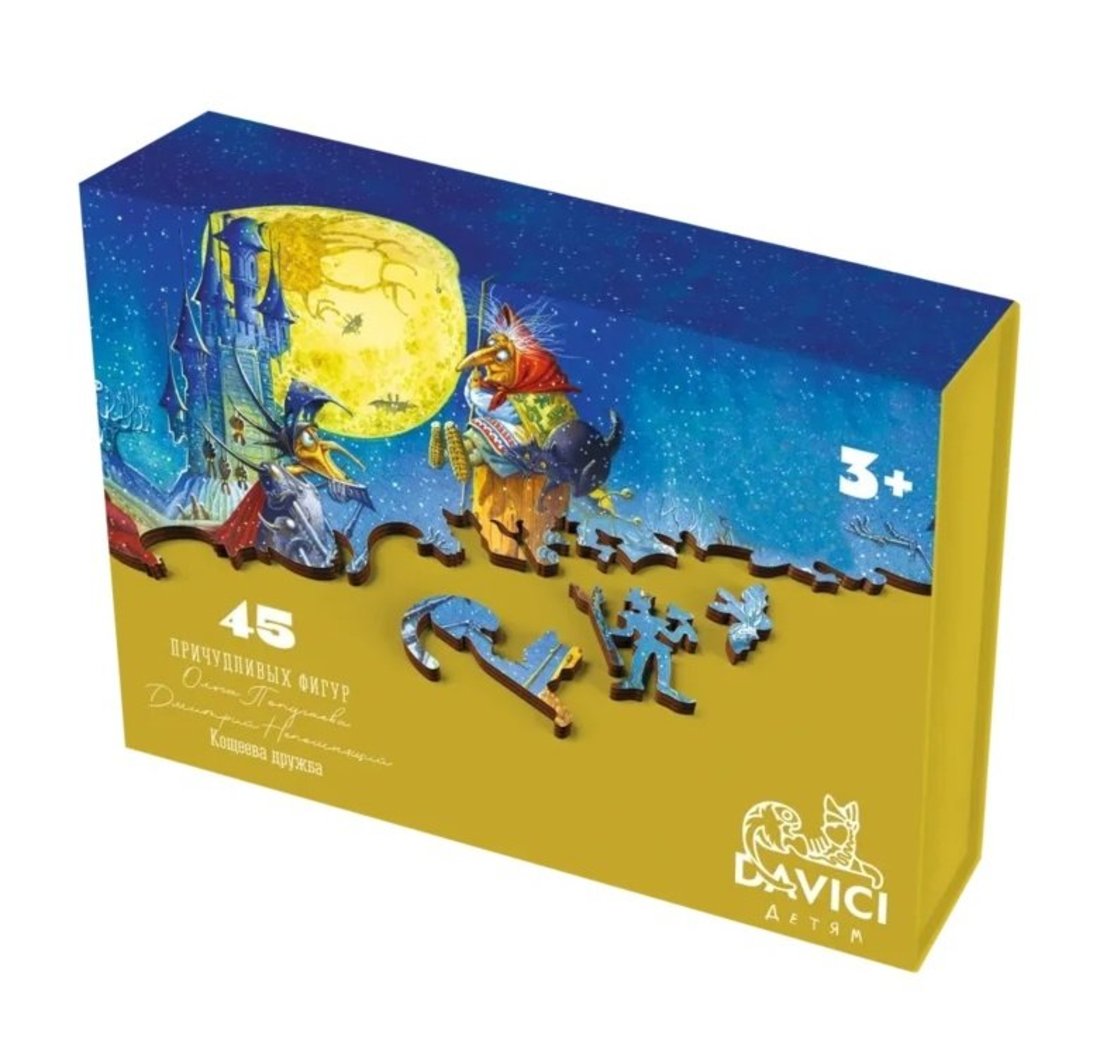 «Что же я всегда один?Сам слуга и господин!Не могу так дальше жить!Я теперь хочу дружить!»Может, с Бабою Ягой?Нет, ответ слишком простой!С кем же? ты раскрой секрет —В этом пазле есть ответ!«Ради друга своегоОтрекусь я от всего.Злым не буду больше я —Будут у меня друзья!Мне для друга моегоИ не жалко ничего!»Ты из меченых деталейСобери, что другу дали!Автор - Марина ОлейниковаРазмер картины: 155х207 ммCложность: Лёгкий уровень, легко собрать за 1-3 часаКоличество деталей: 45.Рекомендовано для детей от 3-х лет.Сделано в России.