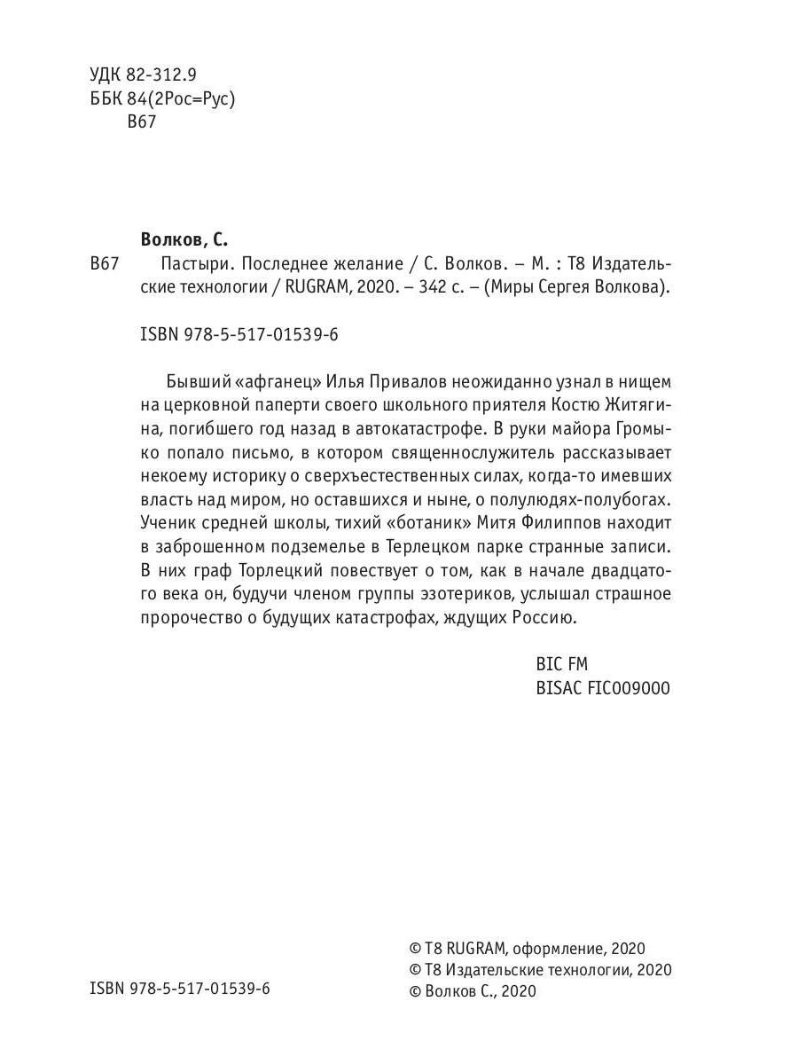 Handling time: 19 days Автор: Волков Сергей, «Пастыри. Последнее желание»: Бывший «афганец» Илья Привалов неожиданно узнал в нищем на церковной паперти своего школьного приятеля Костю Житягина, погибшего год назад в автокатастрофе. В руки майора Громыко попало письмо, в котором священнослужитель рассказывает некоему историку о сверхъестественных силах, когда-то имевших власть над миром, но оставшихся и ныне, о полулюдях-полубогах. Ученик средней школы, тихий «ботаник» Митя Филиппов находит в заброшенном подземелье в Терлецком парке странные записи. В них граф Торлецкий повествует о том, как в начале двадцатого века он, будучи членом группы эзотериков, услышал страшное пророчество о будущих катастрофах, ждущих Россию.