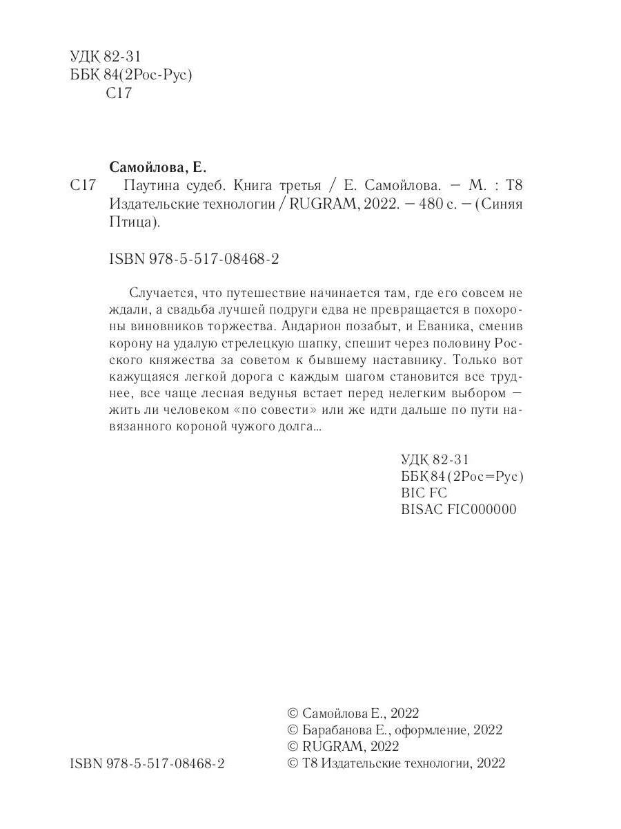 Handling time: 19 days Автор: Самойлова Елена, «Паутина судеб. Книга III»: Случается, что путешествие начинается там, где его совсем не ждали, а свадьба лучшей подруги едва не превращается в похороны виновников торжества. Андарион позабыт, и Еваника, сменив корону на удалую стрелецкую шапку, спешит через половину Росского княжества за советом к бывшему наставнику. Только вот кажущаяся легкой дорога с каждым шагом становится все труднее, все чаще лесная ведунья встает перед нелегким выбором — жить ли человеком «по совести» или же идти дальше по пути навязанного короной чужого долга...