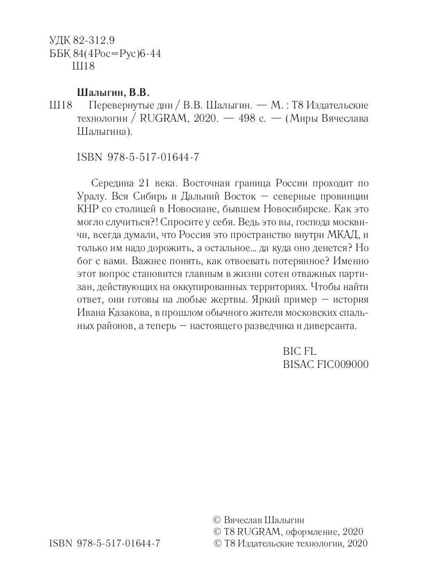Handling time: 19 days Автор: Шалыгин Вячеслав, «Перевернутые дни: сборник»: Середина 21 века. Восточная граница России проходит по Уралу. Вся Сибирь и Дальний Восток — северные провинции КНР со столицей в Новосиане, бывшем Новосибирске. Как это могло случиться?! Спросите у себя. Ведь это вы, господа москвичи, всегда думали, что Россия это пространство внутри МКАД, и только им надо дорожить, а остальное... да куда оно денется? Но бог с вами. Важнее понять, как отвоевать потерянное? Именно этот вопрос становится главным в жизни сотен отважных партизан, действующих на оккупированных территориях. Чтобы найти ответ, они готовы на любые жертвы. Яркий пример — история Ивана Казакова, в прошлом обычного жителя московских спальных районов, а теперь — настоящего разведчика и диверсанта.