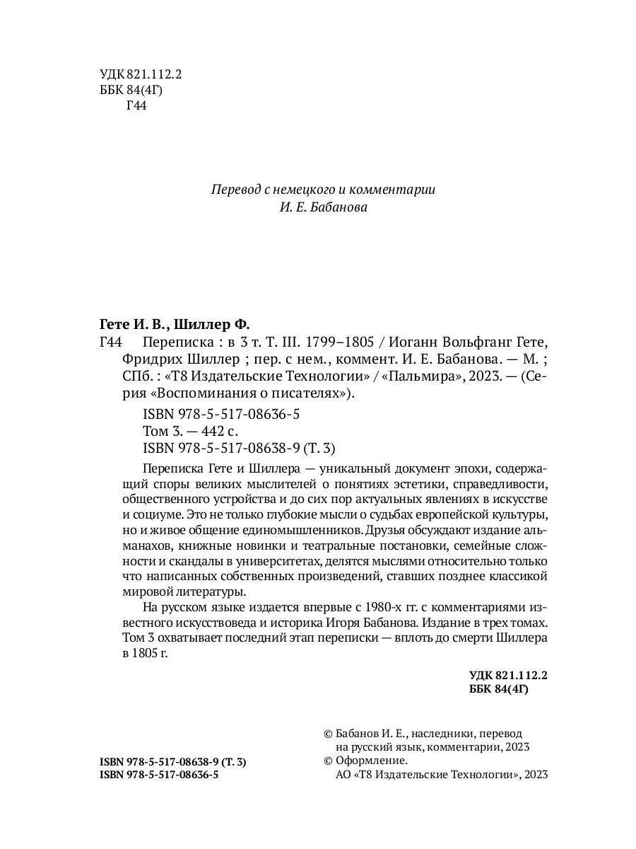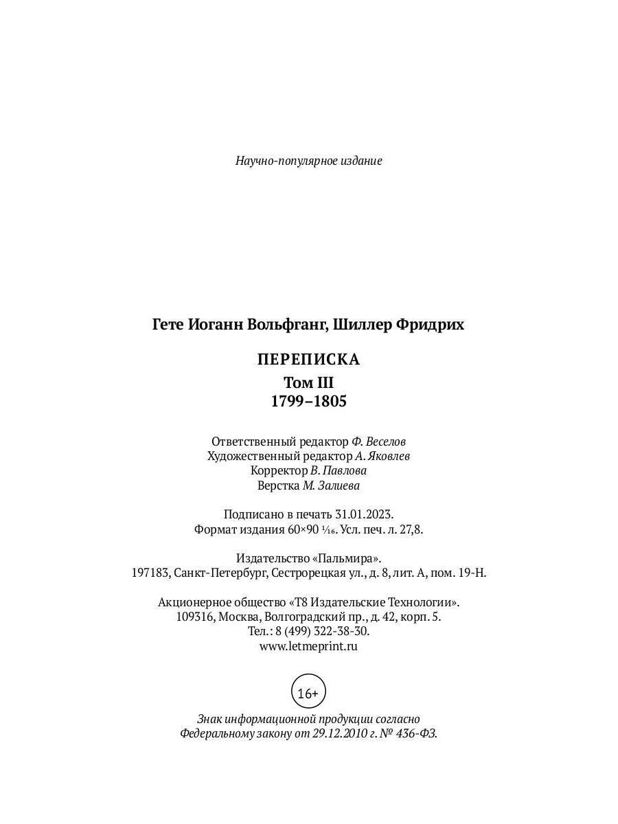 Handling time: 19 days Авторы: Гете И.В., Шиллер Ф., «Переписка: В 3 т. Т. 3. 1799–1805»: Свод писем, которыми обменялись выдающиеся немецкие поэты И. В. Гёте (1749–1832) и Ф. Шиллер (1759–1805) в 1794–1805 гг., представляет собой целостный и уникальный памятник мировой литературы. "Переписка Гёте и Шиллера" в полном объеме была опубликована на русском языке впервые в конце 1980-х годов. Третий том охватывает переписку 1800–1804 гг.