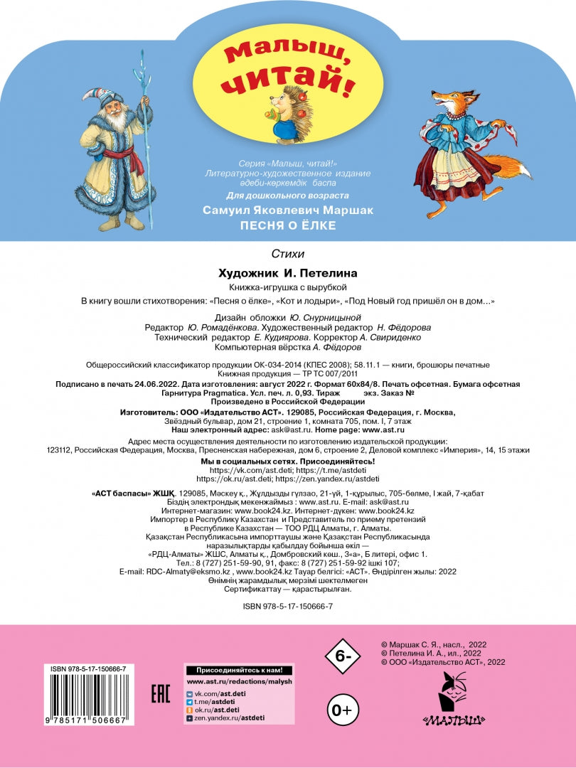Handling time: 19 days Песня о Ёлке. Малыш, читай! Маршак С. Я. Чтобы приблизить Новый год, нужно его позвать. А лучше всего спеть песенку про новогодний праздник, Деда Мороза, Снегурочку и главную красавицу – пушистую ёлочку. В этом поможет наша книга. В неё вошли лучшие песни и стихи известного классика детской литературы С. Маршака. Для дошкольного возраста.