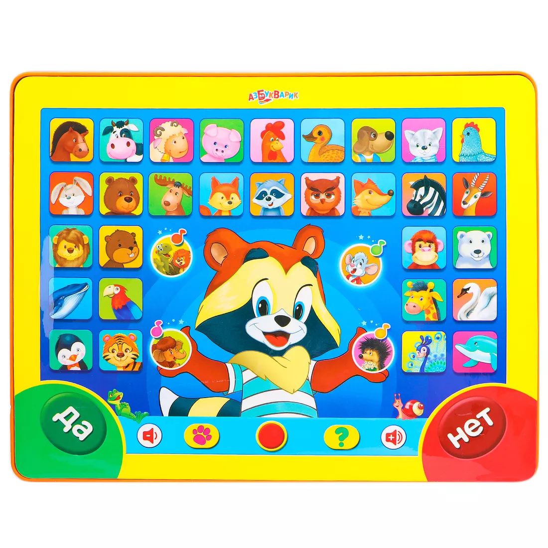 Обучающий планштетик «Загадай – я отгадаю» это музыкальная энциклопедия, с которой ваш ребёнок точно полюбит учиться! Интерактивная игрушка знает ответы на 300 познавательных вопросов об обитателях леса, фермы и зоопарка и говорит голосами 30 животных! Немного веселой игры и ваш малыш станет таким же умным, как наш Крошка Енот!Енот может отгадать любое животное, которое загадает ребёнок. Как это происходит? Ребёнок загадывает животное, включает режим игры, звучит вопрос. Малышу надо ответить на вопрос ДА или НЕТ и нажать на соответствующие кнопки. После нескольких уточняющих вопросов енот отгадает загадку малыша. Уверенны, ваш ребёнок будет в полном восторге от планшета с загадками и захочет попробовать ещё!Игрушечный планшет «Загадай – я отгадаю» развивает речь, интеллект, память, мелкую моторику и музыкальный слух. У игрушки есть режим песенок с 5 композициями на выбор.Хотите, чтобы ваш ребёнок полюбил учиться? Положите планшет Азбукварик в корзину!