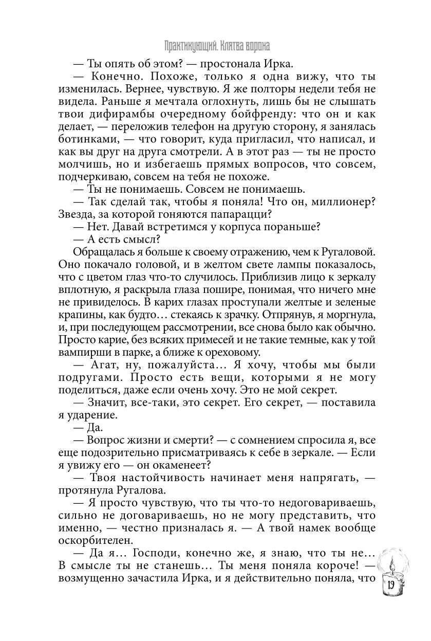 Handling time: 19 days Автор: Воронцова Валерия, «Практикующий. Клятва ворона»: У Агаты Вольской есть все причины подозревать, что ее лучшая подруга угодила в секту. После короткого расследования и знакомства с новой компанией Ирки Агата понимает, что все гораздо сложнее. Сложнее потому, что жизнь после встречи с потомственным темным ведьмаком не может быть простой. Особенно когда он заявляет, что ты — его фамильяр и вам необходимо «заключить связь». Связь, которая изменит все. Пути назад нет, ведь любовь его не предоставляет, и перед Агатой открывается мир Практикующих. Мир, где вопросов больше, чем ответов, клятвы сильнее чувств, а каждая тайна несет в себе угрозу. 5 причин купить книгу «Практикующий. Клятва ворона» Валерии Воронцовой: 1. Русское городское фэнтези в сеттинге современной Тулы; 2. Магический реализм и оригинальная система магии – вы захотите узнать собственную сущность! 3. Сложные жаркие отношения саркастичных властного вранового героя и сильной героини; 4. Атмосферное сочетание мистики и повседневности в сопровождении русского рока; 5. Роковые тайны, приключения и смертельные опасности для харизматичных темных и светлых практиков, каждый из которых не оставит вас равнодушным.