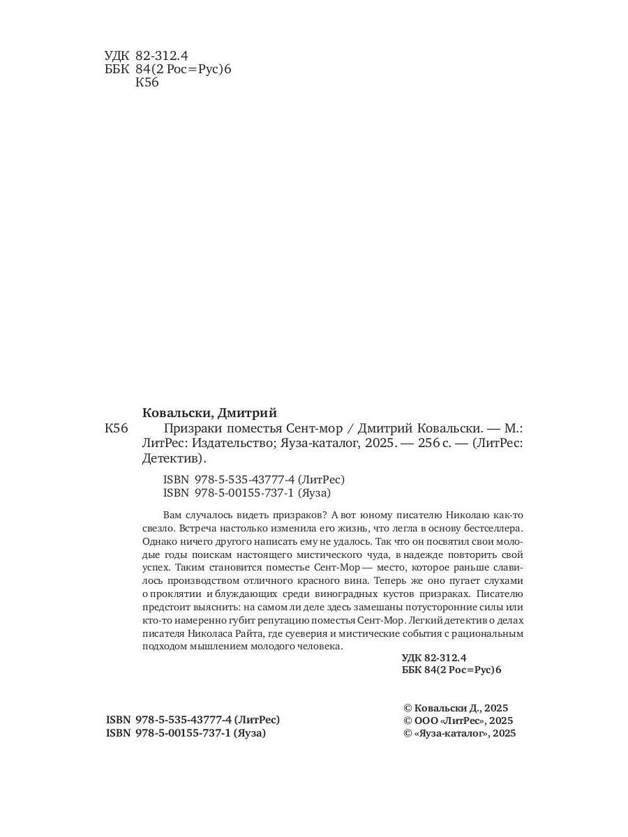 Handling time: 19 days Автор: Ковальски Дмитрий, «Призраки поместья Сент-мор»: Вам случалось видеть призраков? А вот юному писателю Николаю как-то свезло. Встреча настолько изменила его жизнь, что легла в основу бестселлера. Однако ничего другого написать ему не удалось. Так что он посвятил свои молодые годы поискам настоящего мистического чуда, в надежде повторить свой успех. Такой случай подворачивается в поместьи Сент-Мор — месте, которое раньше славилось производством отличного красного вина. Теперь же оно пугает слухами о проклятии и блуждающих среди виноградных кустов призраках. Писателю предстоит выяснить: на самом ли деле здесь замешаны потусторонние силы или кто-то намеренно губит репутацию поместья Сент-Мор. Легкий детектив о делах писателя Николаса Райта, где суеверия и мистические события сталкиваются с рациональным мышлением молодого человека.