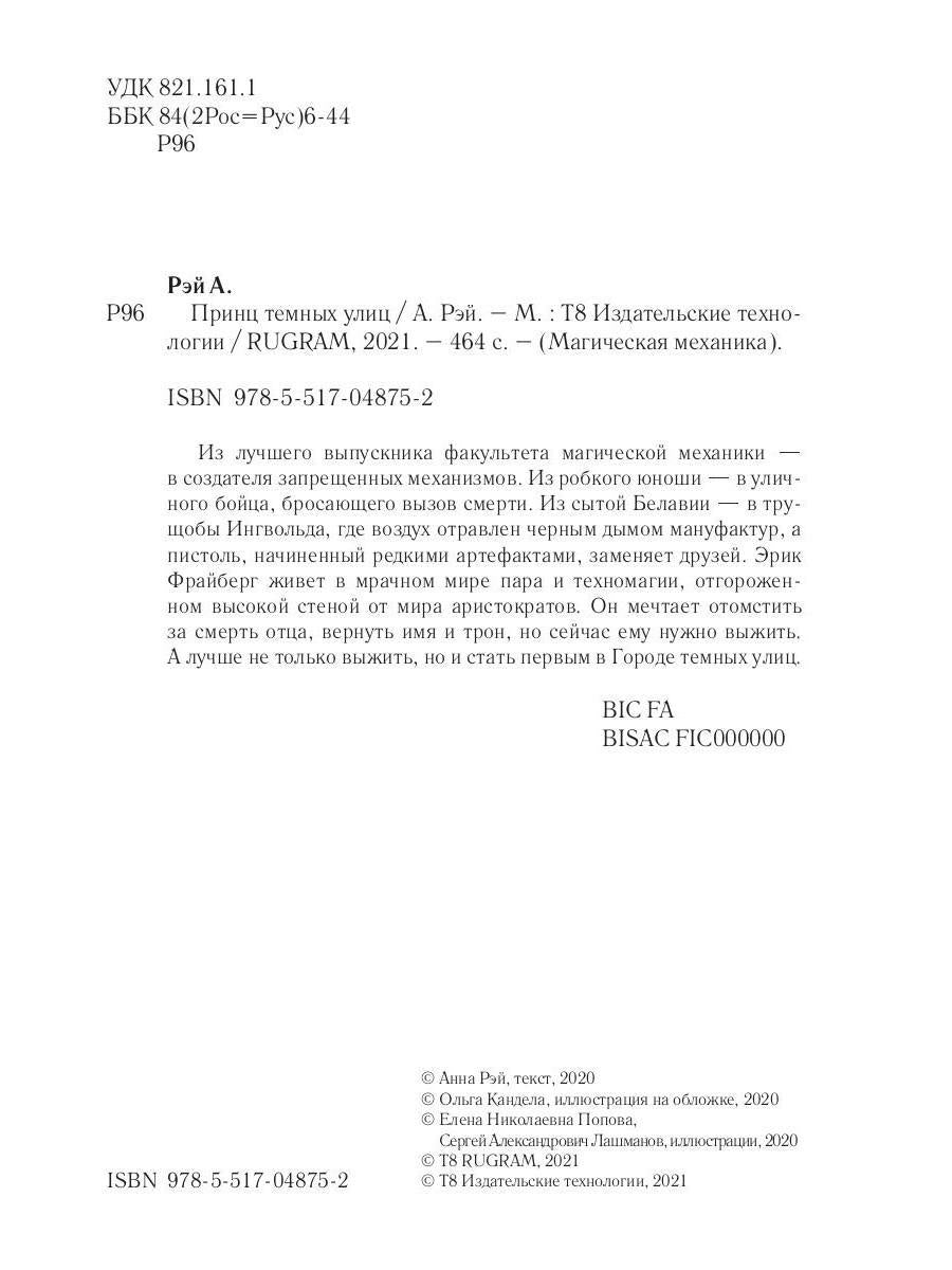 Handling time: 19 days Автор: Рэй Анна, «Принц темных улиц»: Из лучшего выпускника факультета магической механики — в создателя запрещенных механизмов. Из робкого юноши — в уличного бойца, бросающего вызов смерти. Из сытой Белавии — в трущобы Ингвольда, где воздух отравлен черным дымом мануфактур, а пистоль, начиненный редкими артефактами, заменяет друзей. Эрик Фрайберг живет в мрачном мире пара и техномагии, отгороженном высокой стеной от мира аристократов. Он мечтает отомстить за смерть отца, вернуть имя и трон, но сейчас ему нужно выжить. А лучше не только выжить, но и стать первым в Городе темных улиц.