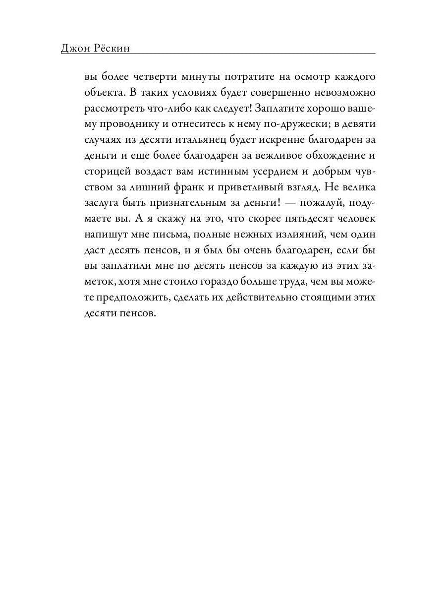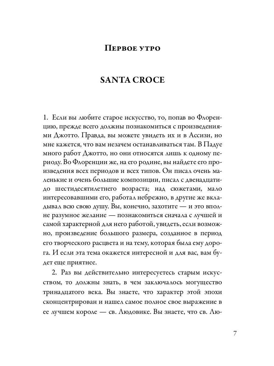 Handling time: 19 days Автор: Рескин Джон, «Прогулки по Флоренции»: «Прогулки по Флоренции» написаны Джоном Рёскиным в 1877 году. Путеводитель по Флоренции, с ее, как позднее напишет И. Бродский «архитектурой рая», представляет собой не шесть глав -«шесть утр». «Дождитесь ясного утра, - пишет Рёскин, - встаньте вместе с солнцем и пойдите в Santa Croce с хорошим биноклем в кармане, который поможет вам рассмотреть не один шедевр». Сегодняшнему читателю не составит труда найти в интернете какое-либо большое произведение искусства Ренессанса в мельчайших подробностях, но чтобы проникнуть в его суть, необходим проводник. Эрудит, обаятельный рассказчик и поэт Рёскин проведет читателя по знаковым памятникам Флоренции, подскажет лучший ракурс для обзора, снабдит необходимыми цитатами из Данте, историческими фактами, а главное, пробудит в нем желание увлеченно исследовать искусство эпохи Возрождения.