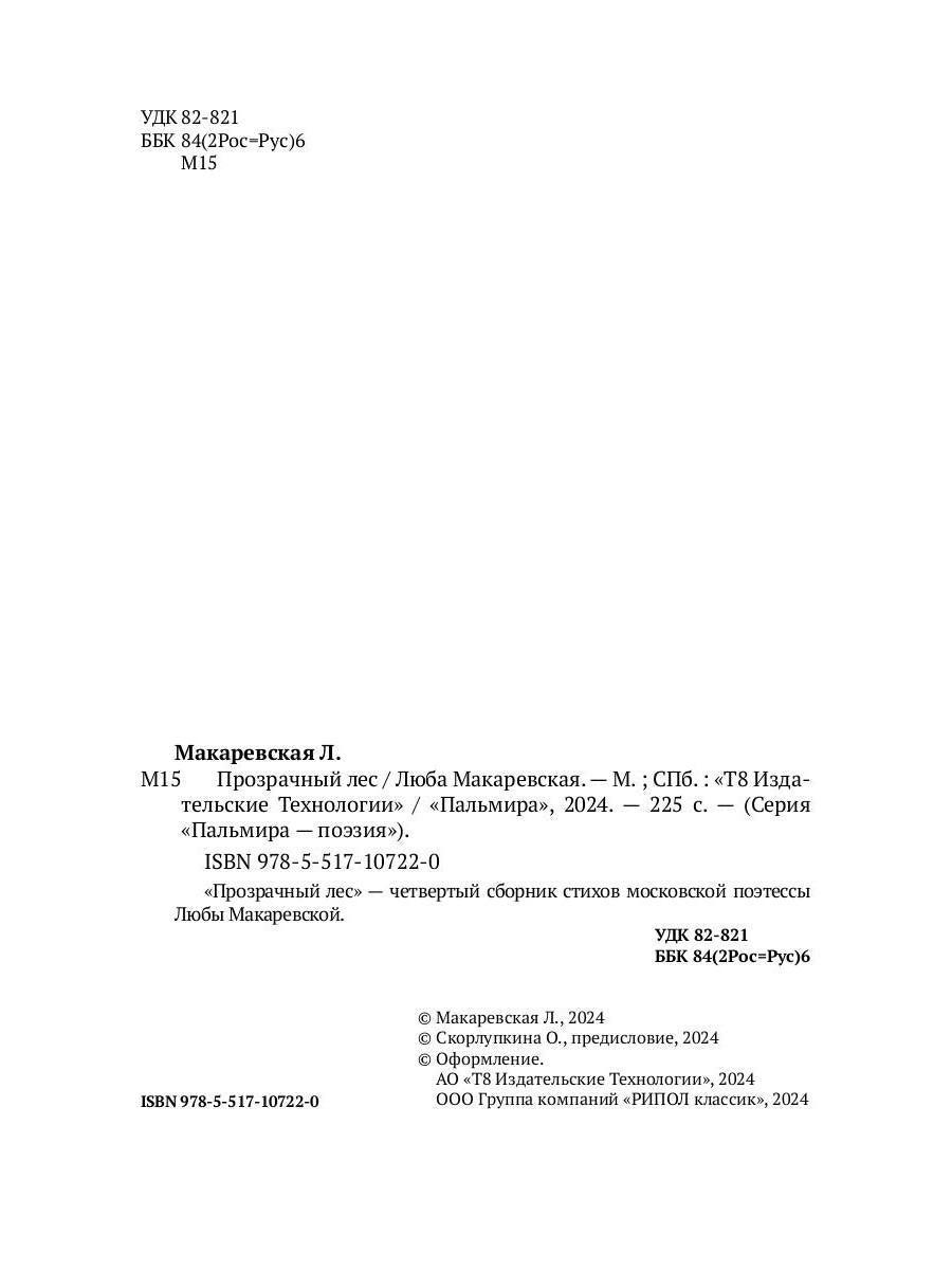 Handling time: 19 days Автор: Макаревская Любовь, «Прозрачный лес»: «Прозрачный лес» - четвертый сборник стихов московской поэтессы Любы Макаревской.